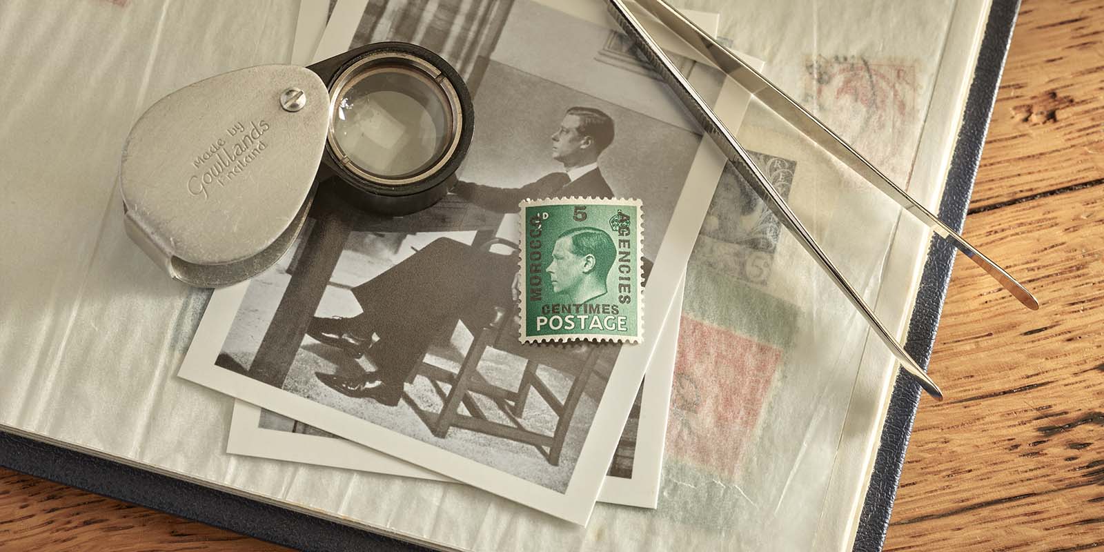 Also included in this set is a 1936 green halfpenny stamp, first issued on 1 September 1936, that features Edward VIII’s portrait by Hugh Cecil. The stamp was designed by Hubert J Brown, a 17-year-old who submitted his idea to stamp printers Harrison and Sons. The stamp included in this set has been overprinted with the word ‘MOROCCO AGENCIES’ to be used in British post offices in Morocco.