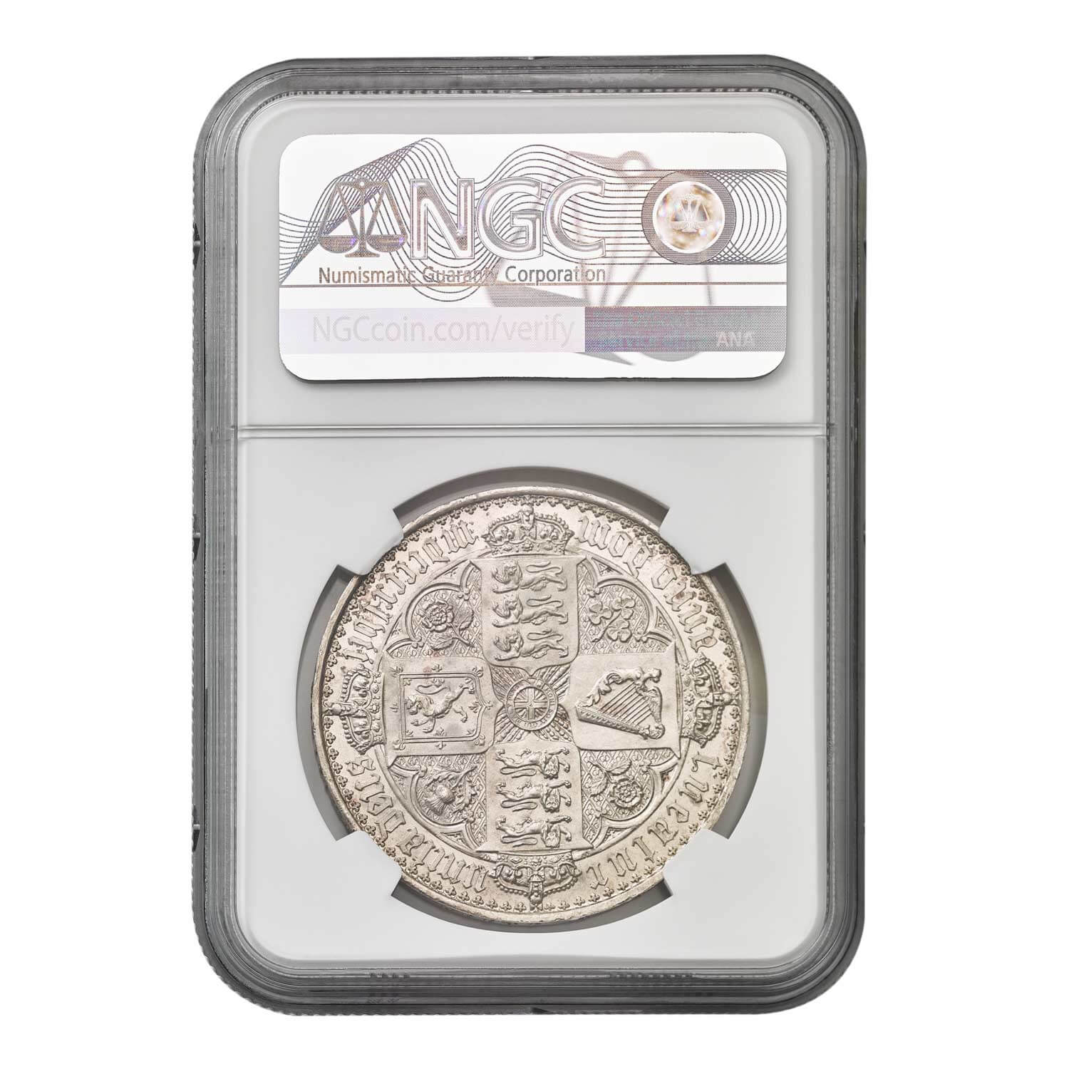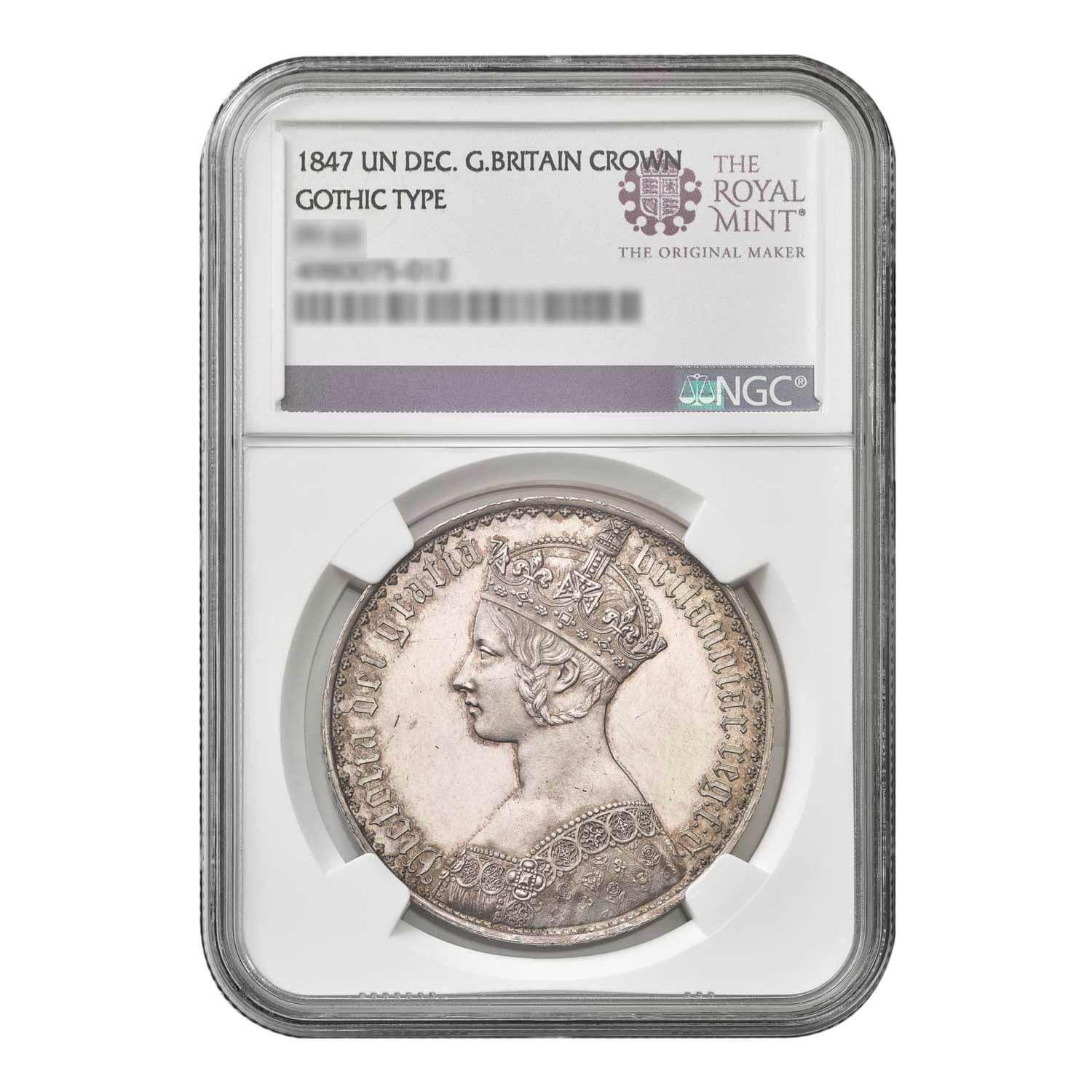 The Gothic crown was Introduced in 1847, and was designed by the great William Wyon, former Chief Engraver at the Royal Mint. Queen Victoria was portrayed in a Gothic/ medieval style, representing the fanciful splendour of the era. She faces left and wears an ornate crown and its tip cuts through the border of trefoil which arcs around the coins inner edge. The inscription, placed below the arching trefoil, is in a medieval gothic style font in upper and lower case. Queen Victoria wears a dress embroidered with roses representing England, thistles representing Scotland and Shamrocks representing Ireland. This was the first time since the coinage of Charles II that a monarch wore a crown on British coinage.