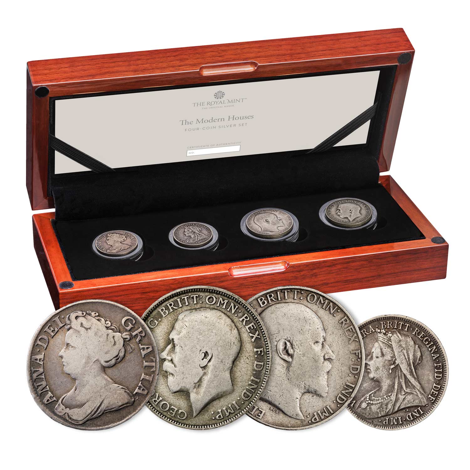 The House of Hanover Premium Set also charts the end of the guinea and reintroduction of The Sovereign to British coinage following the recoinage of 1816. It comprises three half-guineas from the reigns of George I, George II and Britain’s longest-reigning king, George III, and three Half-Sovereigns struck during the reigns of George IV, William IV and Queen Victoria.