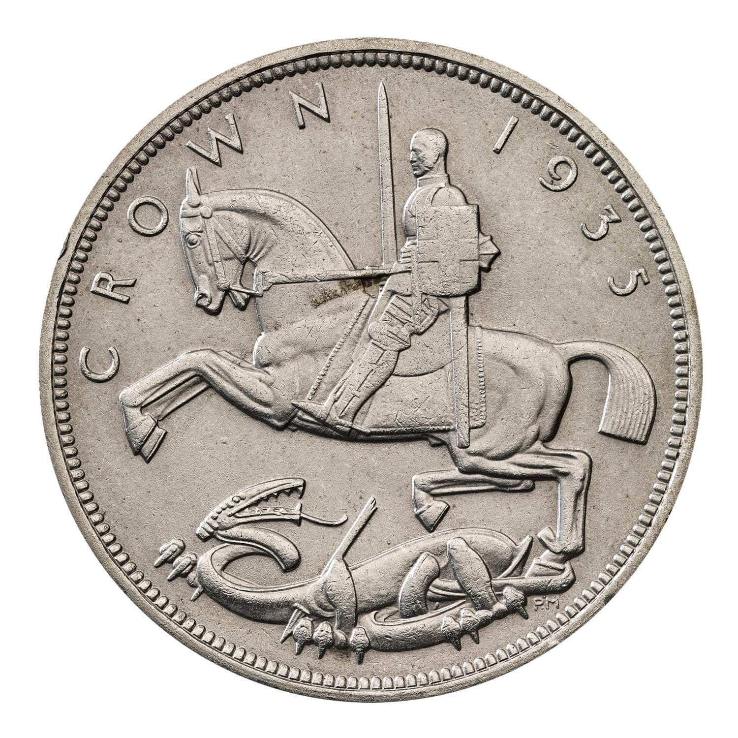 Crowns were issued regularly during the reign of George V but in 1935 a special design was released to commemorate his 25th year on the throne, his Silver Jubilee. The Silver Jubilee crown of 1935 was struck primarily in silver, but a very small number were produced in gold.