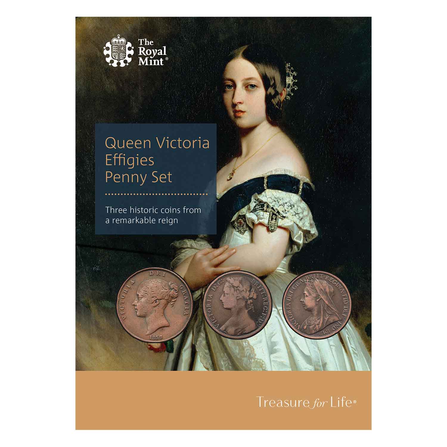 Three pennies chart a golden age when Britain really did rule the waves. Coins featuring William Wyon’s neoclassical ‘Young Head’ portrait, the ‘Bun Head’ portrait by Leonard Charles Wyon and Thomas Brock RA’s ‘Old Head’ effigy which replaced it until her death in 1901, are presented together in one complete set.