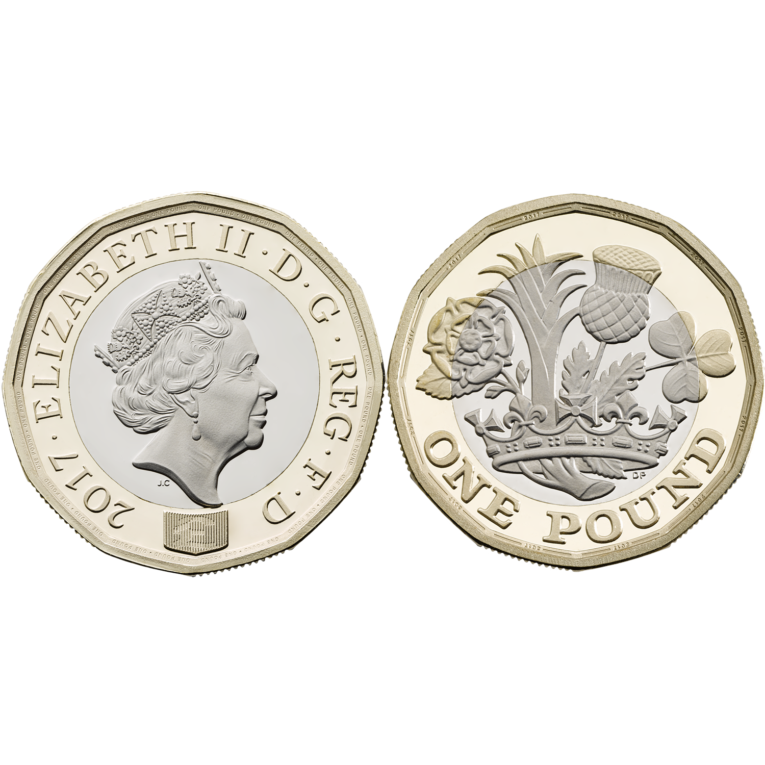 To complement its cutting-edge technology, including The Royal Mint’s patented High Security Feature, the new 12-sided £1 coin acknowledges its heritage in its reverse design. Designed by 15-year-old David Pearce, it features the four floral emblems of the regions of the United Kingdom, a popular theme on £1 coins since their introduction in 1983. The rose, leek, thistle and shamrock emerge from a single stem within a royal coronet.