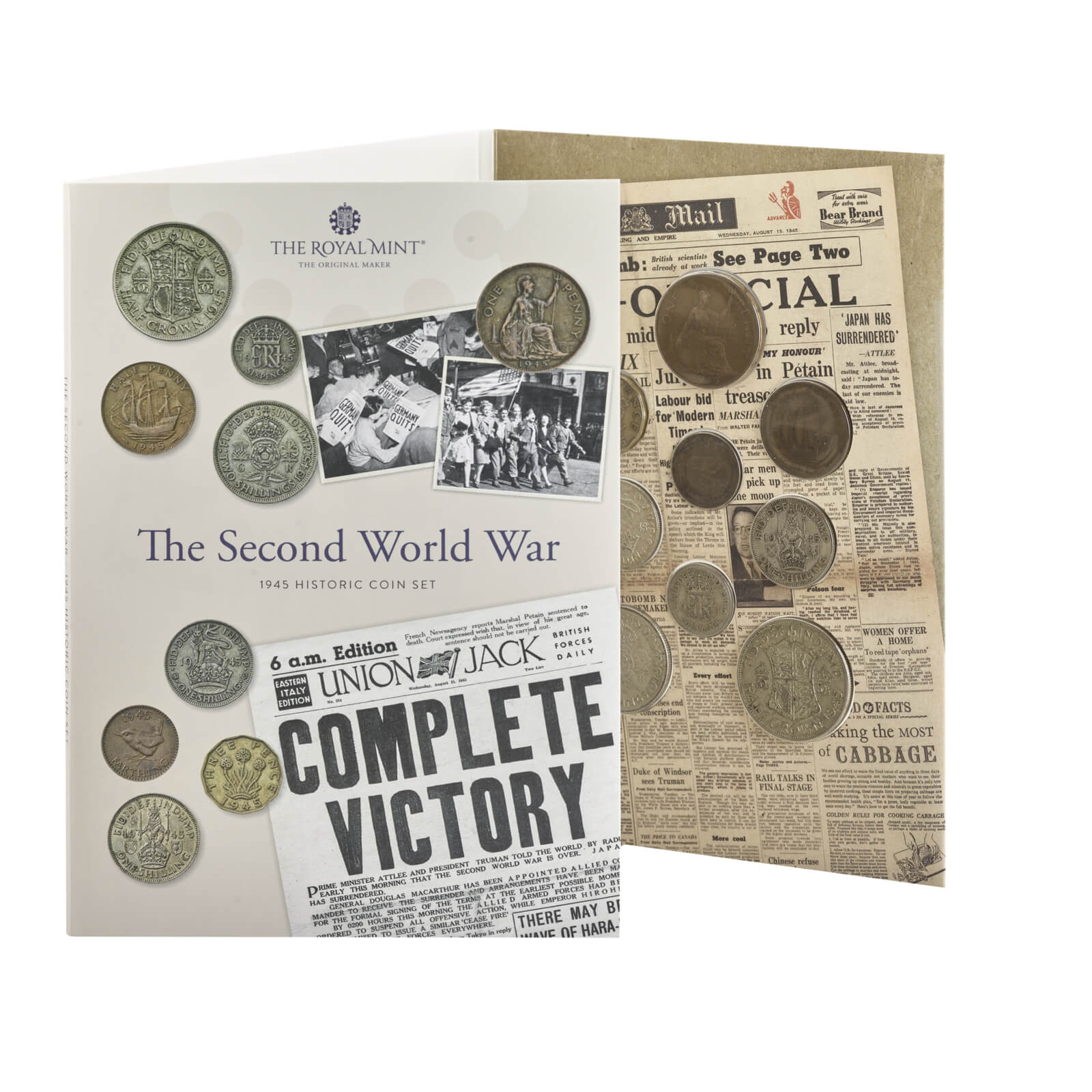 A set of circulating coins from 1945 tells the story of the final year of the Second World War – a year that saw victories in Europe and the Far East spark euphoric celebrations across the world.