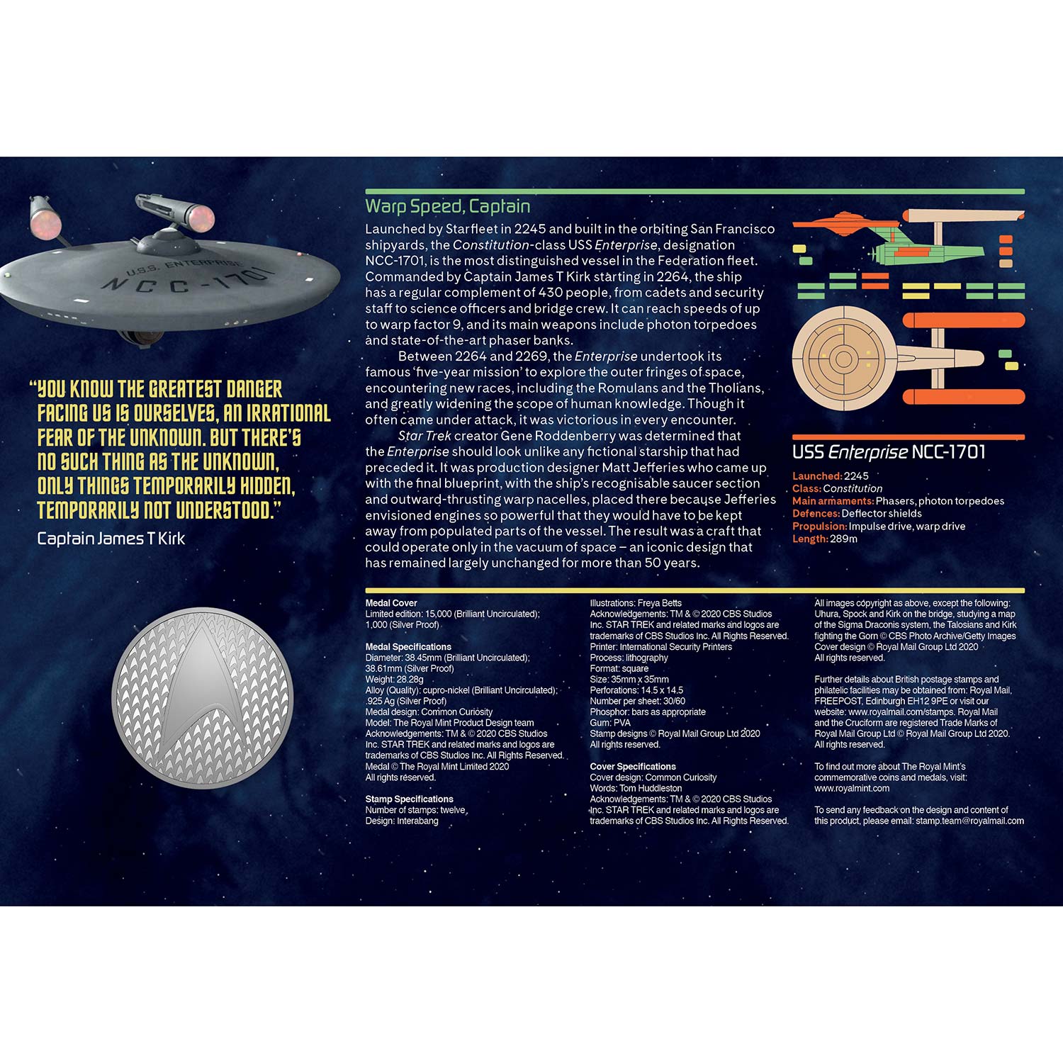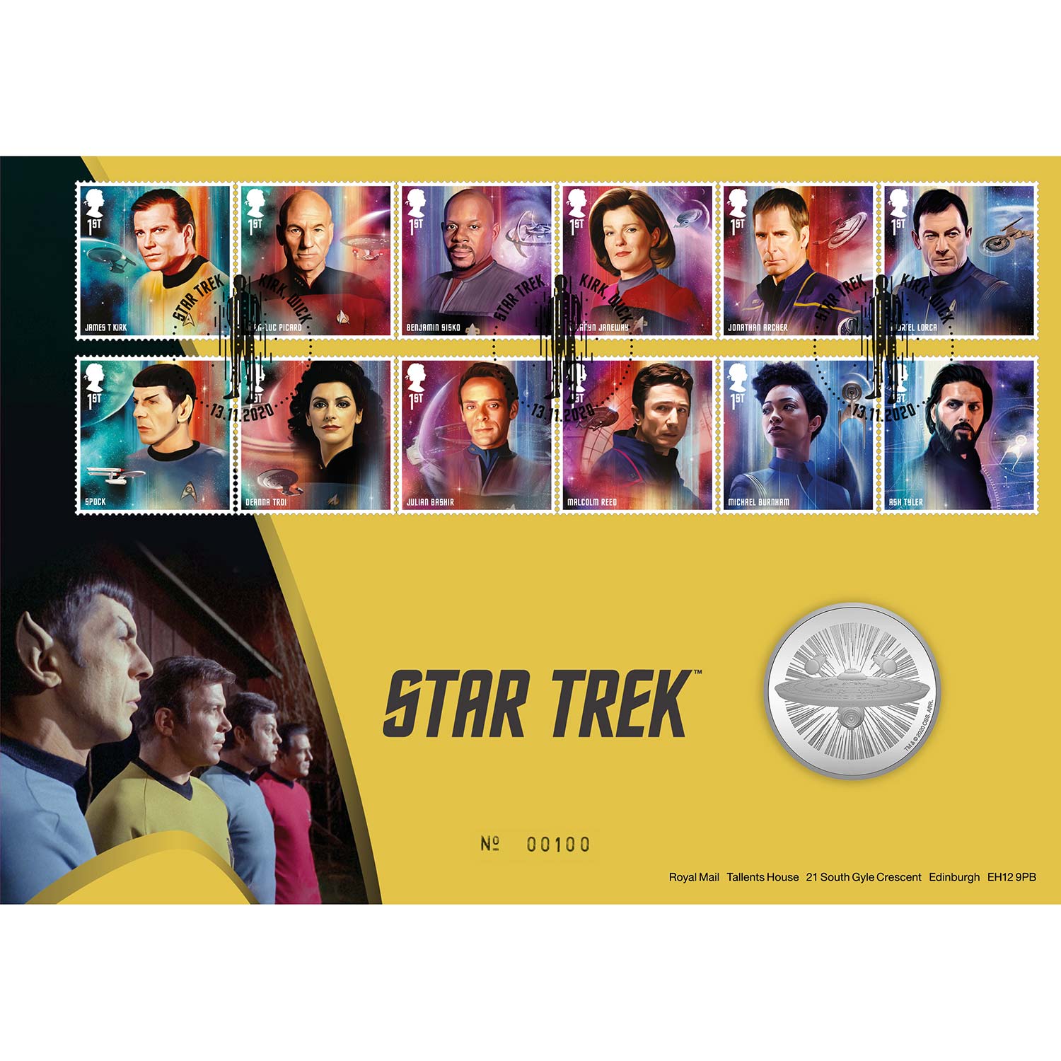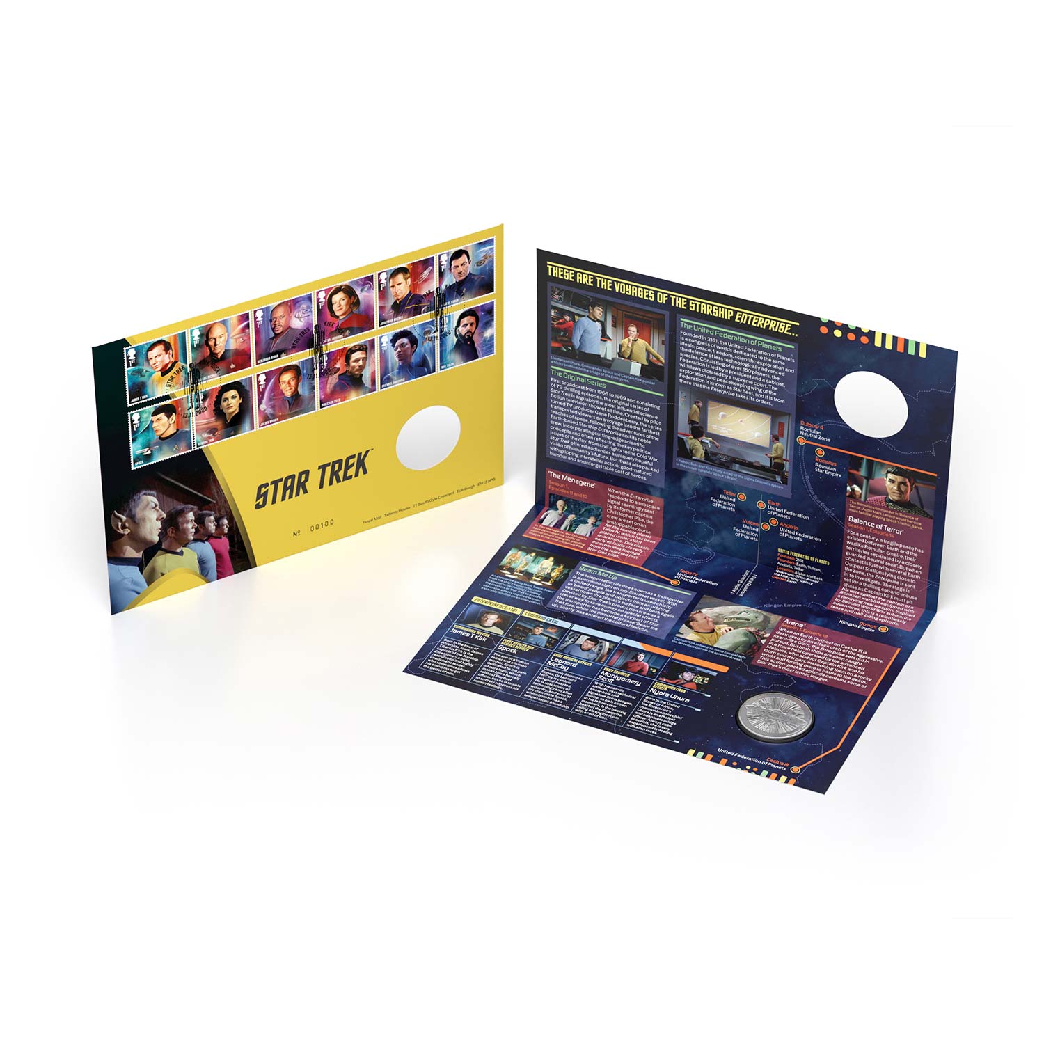 The envelope’s cover design honours the series’ design theme; the reverse features a photograph of James T Kirk and Spock alongside the Starfleet delta and the iconic first line from the series’ title sequence monologue – ‘Space: The final frontier’.