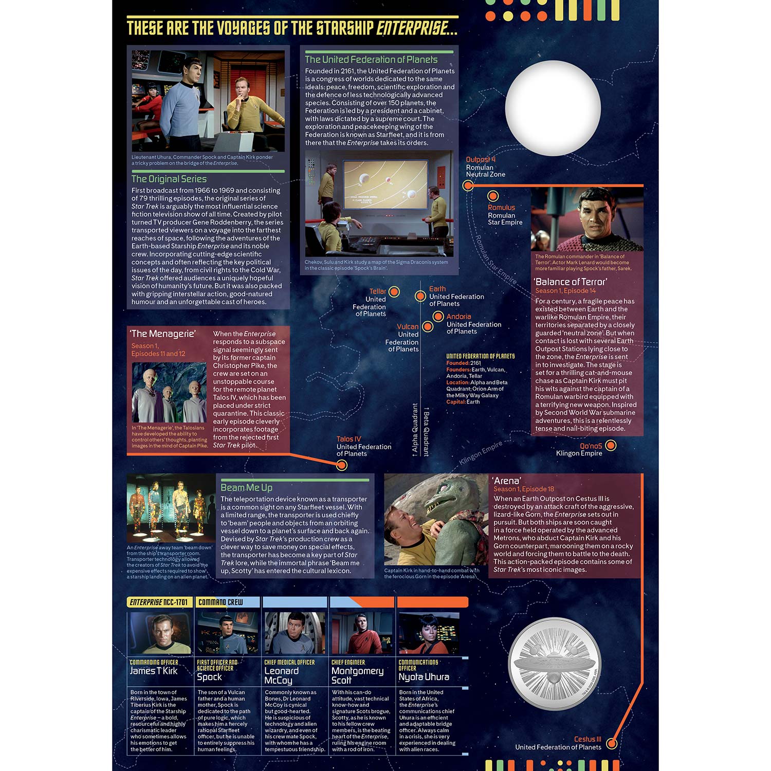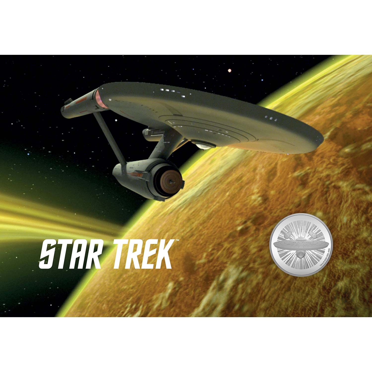 The cupro-nickel medal, struck by The Royal Mint, includes an image of the original USS Enterprise on the front; the reverse depicts the Starfleet delta insignia worn on crew uniforms in the first series.