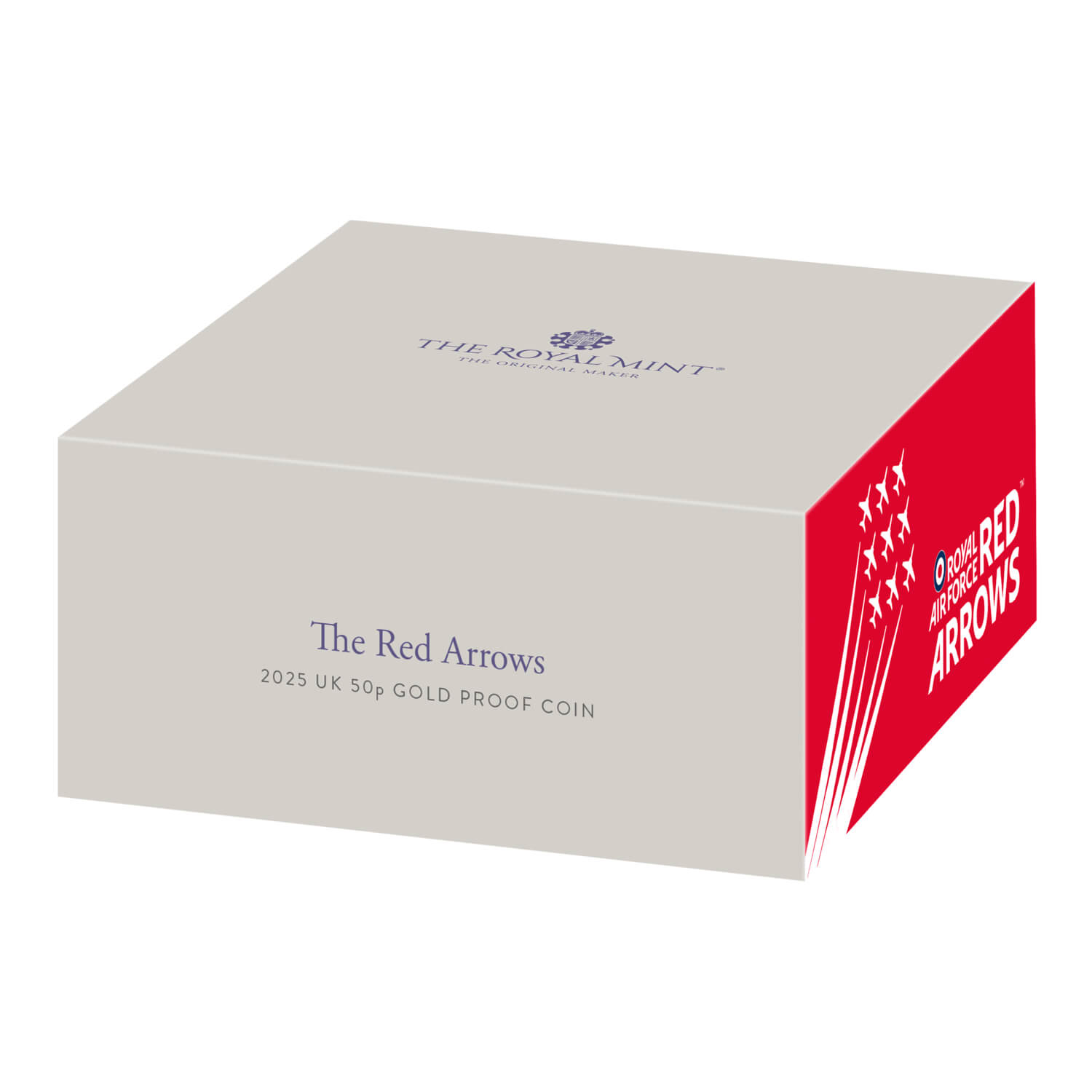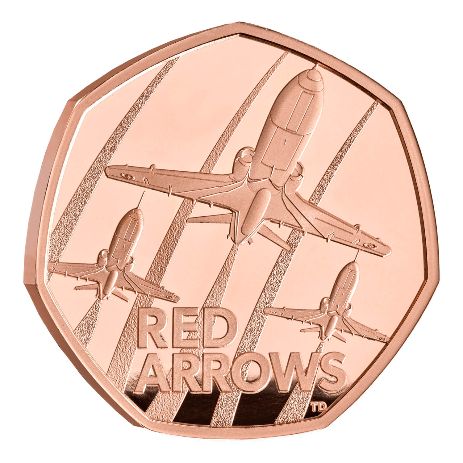 The Red Arrows represent the excellence and precision of the Royal Air Force. Since their first display in 1965, the Red Arrows have performed in nearly 5,000 aerial displays across 57 countries. This year marks 60 years since their first display and in that time, they have become renowned for their captivating precision flying. This gold Proof coin features a design of the distinctive Hawk T1 aircraft on the reverse in a design by Nigel Tudman at Tuch Design.