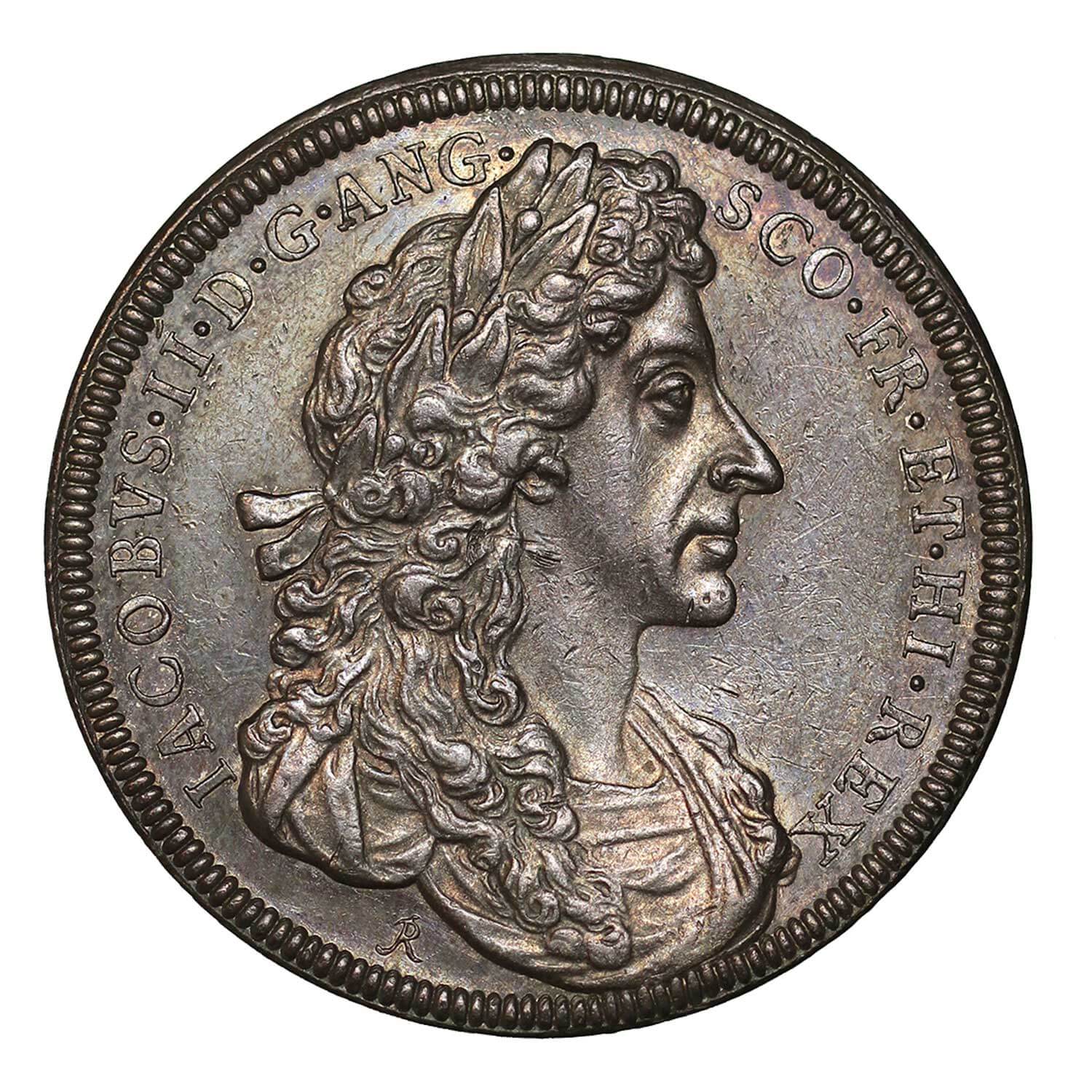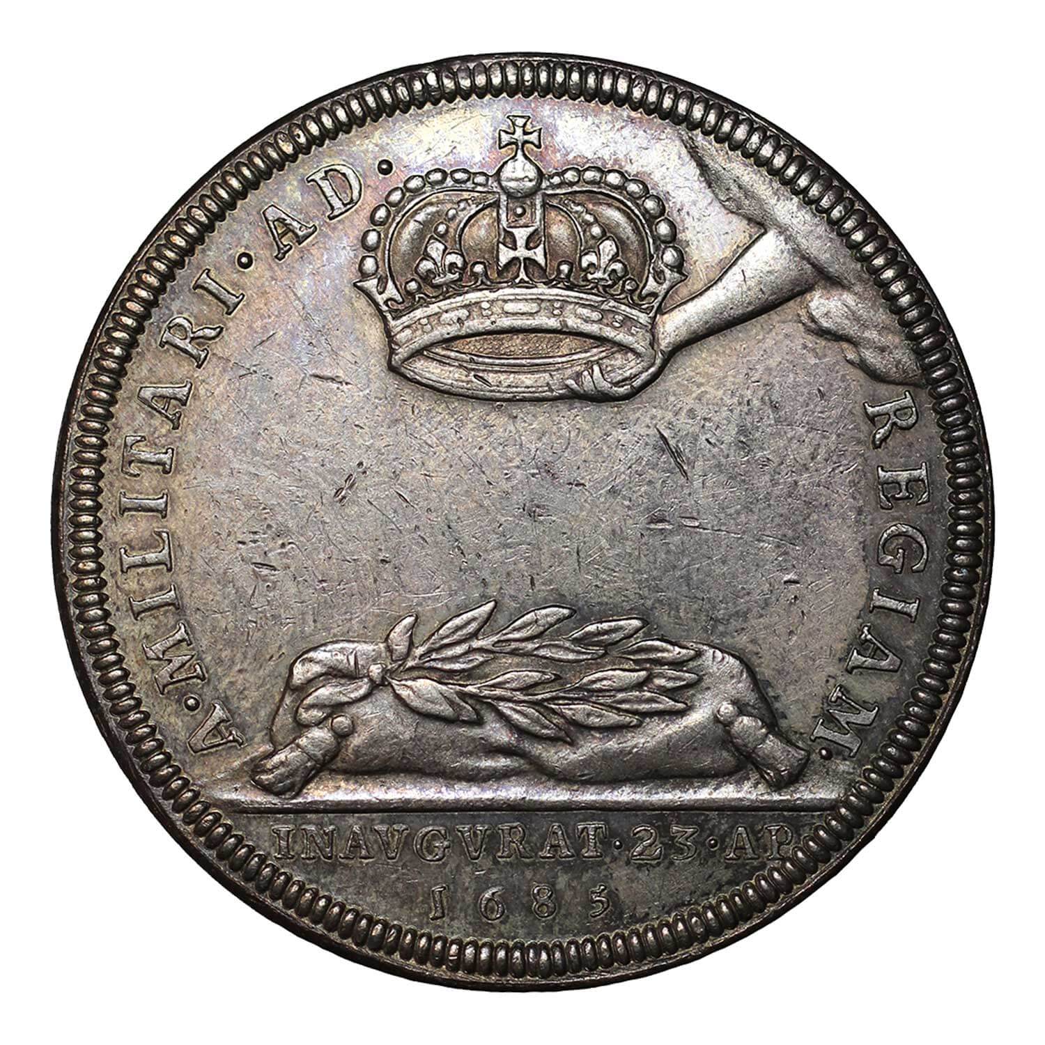 The official issue for the coronation. Struck from more than one pair of dies; the obverse is sometimes found coupled with that of the coronation medal of Queen Mary in 1685.