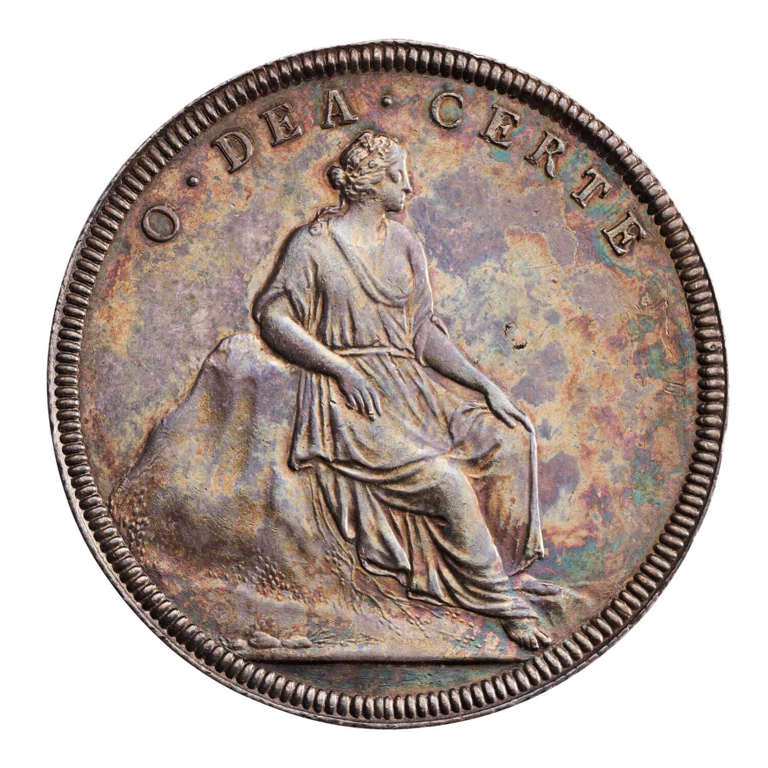 In 1673, James II married Mary Beatrice, daughter of Alphonso IV, Duke of Modena. At James II’s coronation, Mary subsequently became the first queen to be crowned in Britain since the restoration of the monarchy in 1660. Produced for the coronation of James II, which took place on 23 April 1685, this medal was struck from more than one pair of dies, and is sometimes found coupled with the lettering ‘CORONATION OF JAMES II 1685’. The obverse of the medal features a laureate portrait of Mary with a draped bust, whilst the reverse features the queen seated upon a mound and finished with the inscription ‘O. DEA. CERTE. FINESS’.