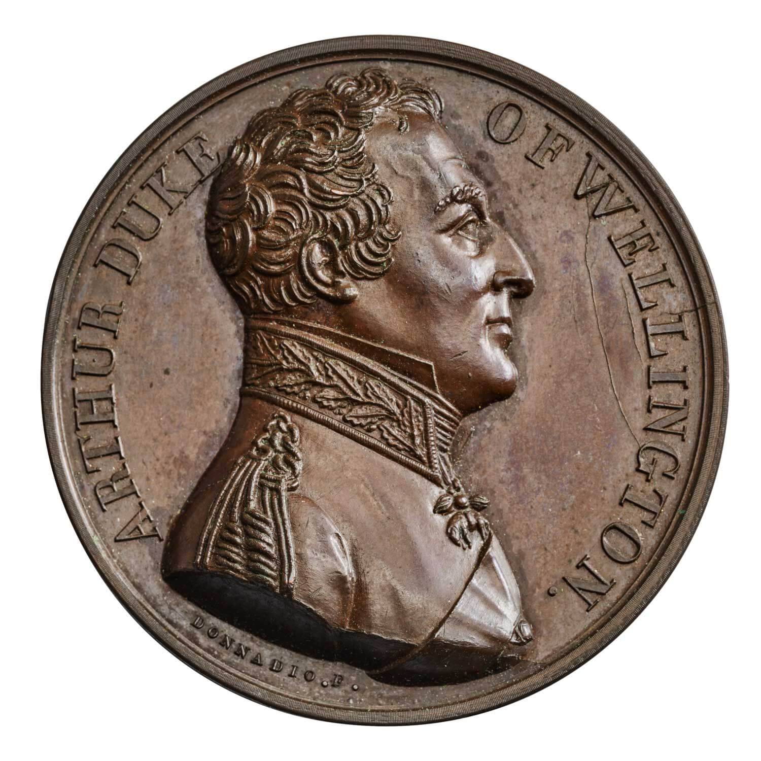 This 1809 year-dated medal celebrates the British victory at the Battle of Talavera, led by Arthur Wellesley, the first Duke of Wellington. The bronze medal is in Extremely Fine condition. The obverse designed by George Mills features a bust of the Duke of Wellington, surrounded by the inscription ‘ARTHUR DUKE OF WELLINGTON’.