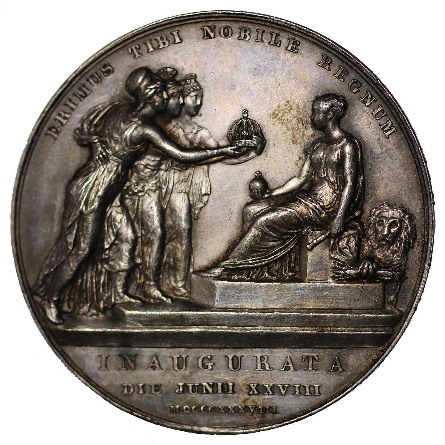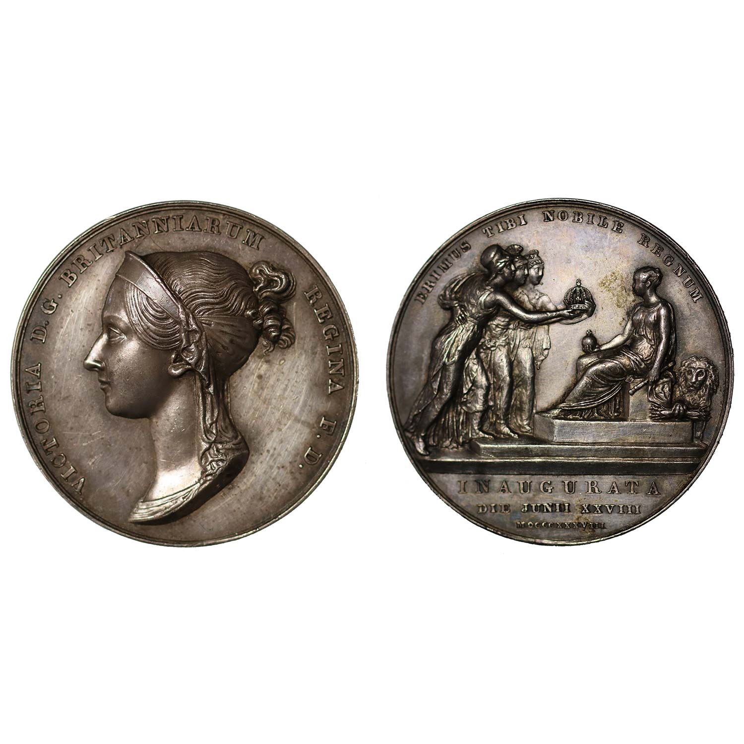 Struck to commemorate the coronation of Victoria this silver medal has a young bust of Victoria by Pistrucci on the obverse and on the reverse Britannia, Hibernia and Scotia offer the crown to Victoria. In about Extremely Fine condition with an extremely rare named edge. It's likely that the medal specifically commemorates Pendygrass's service as chorister at the coronation, and presumably he was awarded it in an official manner.