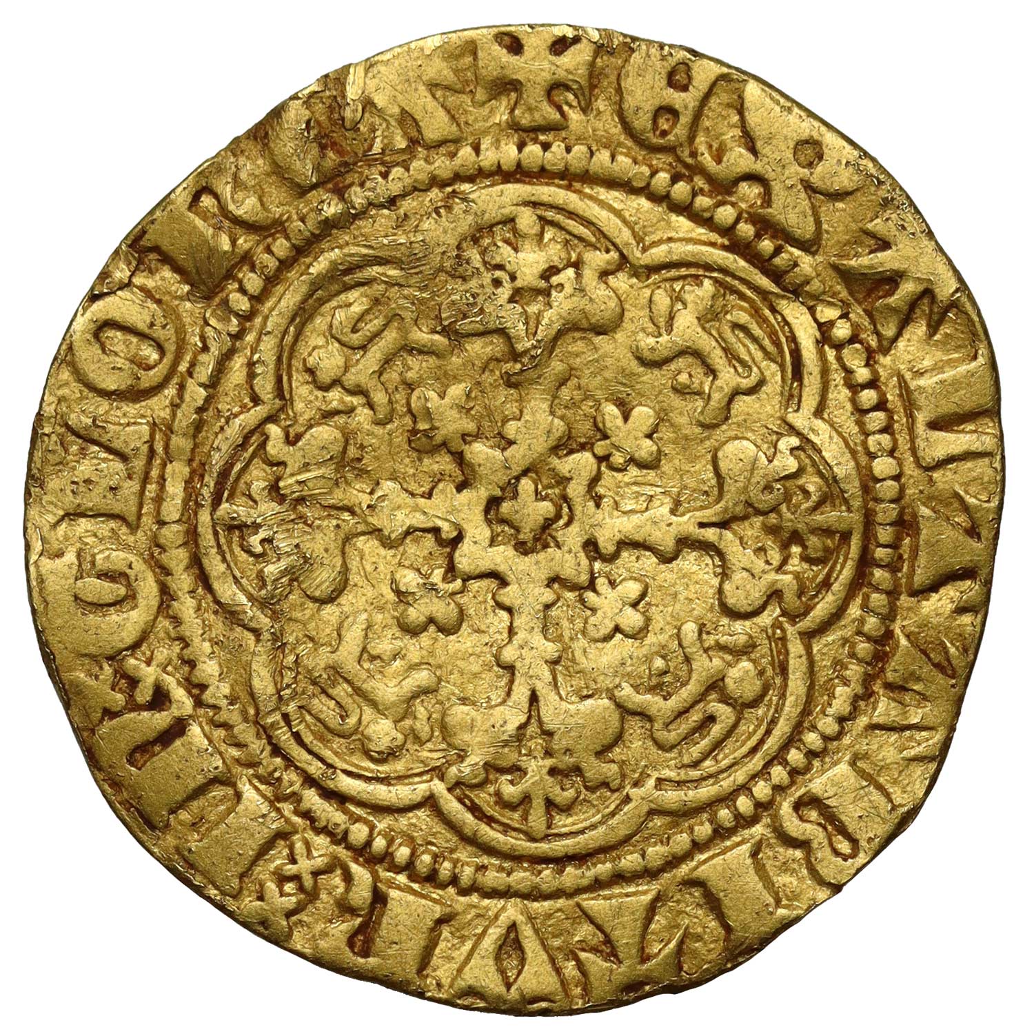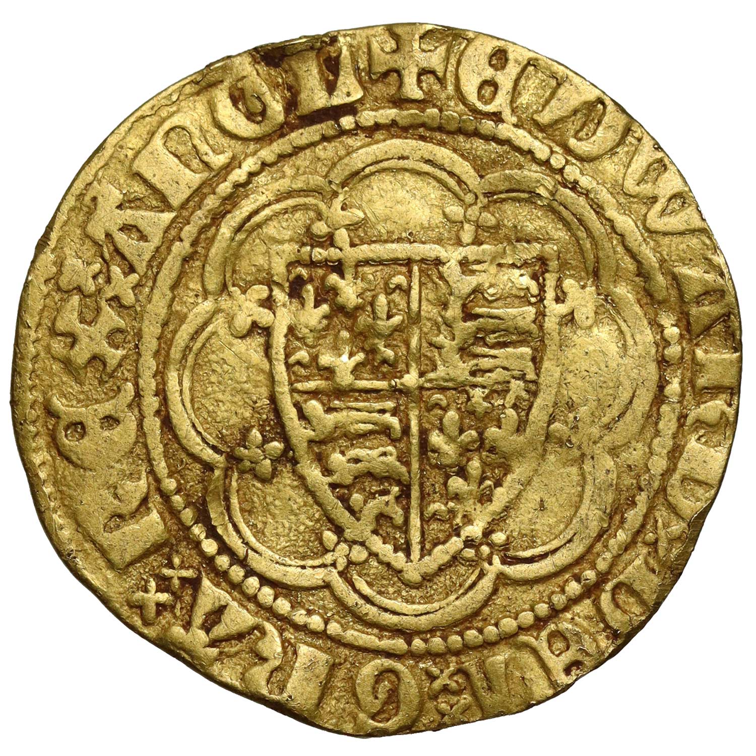 The obverse featured a striking design of the king on a ship holding a shield bearing the king’s Coat of Arms. Designs on the smaller denominations were similar, with the quarter-noble simply displaying the shield. This was the first gold coin to be produced in large numbers and would continue to be struck for circulation for over 100 years.