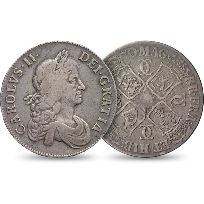 With the execution of Charles I in 1649, rule passed to the Commonwealth and later the Protectorate. But the republic under Oliver Cromwell would prove short-lived. In 1660 the British monarchy was restored under the returning Charles II, exiled in mainland Europe since his defeat at the Battle of Worcester in 1651. Two years later this crown was issued for circulation, one of the first examples of mill striking as production moved away from traditional hammer struck coins.