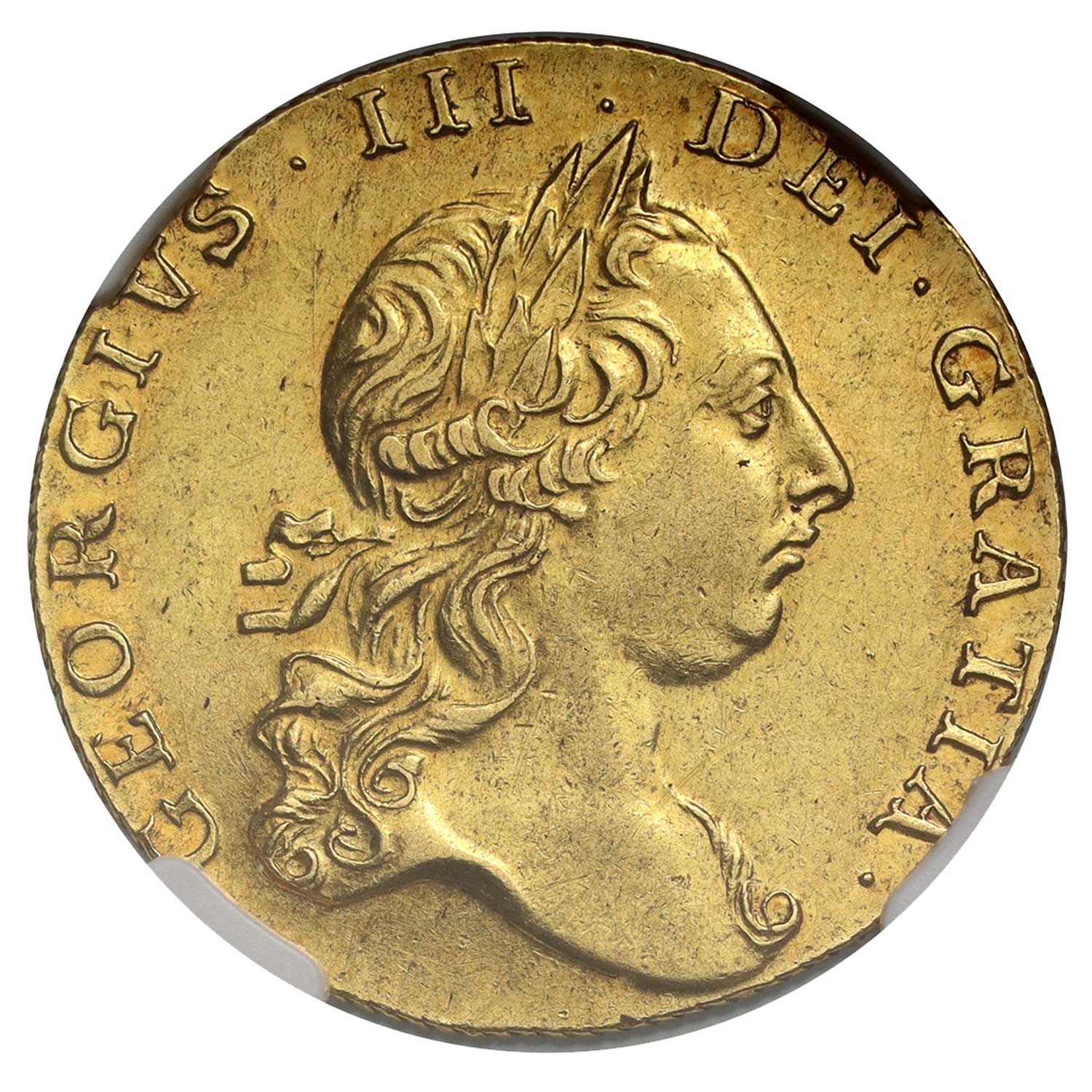 Weighing 8.38 grams and struck in 22 carat gold (0.9167 fineness), this Guinea has been graded by NGC as AU58, currently the highest graded example at both major grading services. It exhibits toning with some lustre in the legends, along with minor surface marks and hairlines.