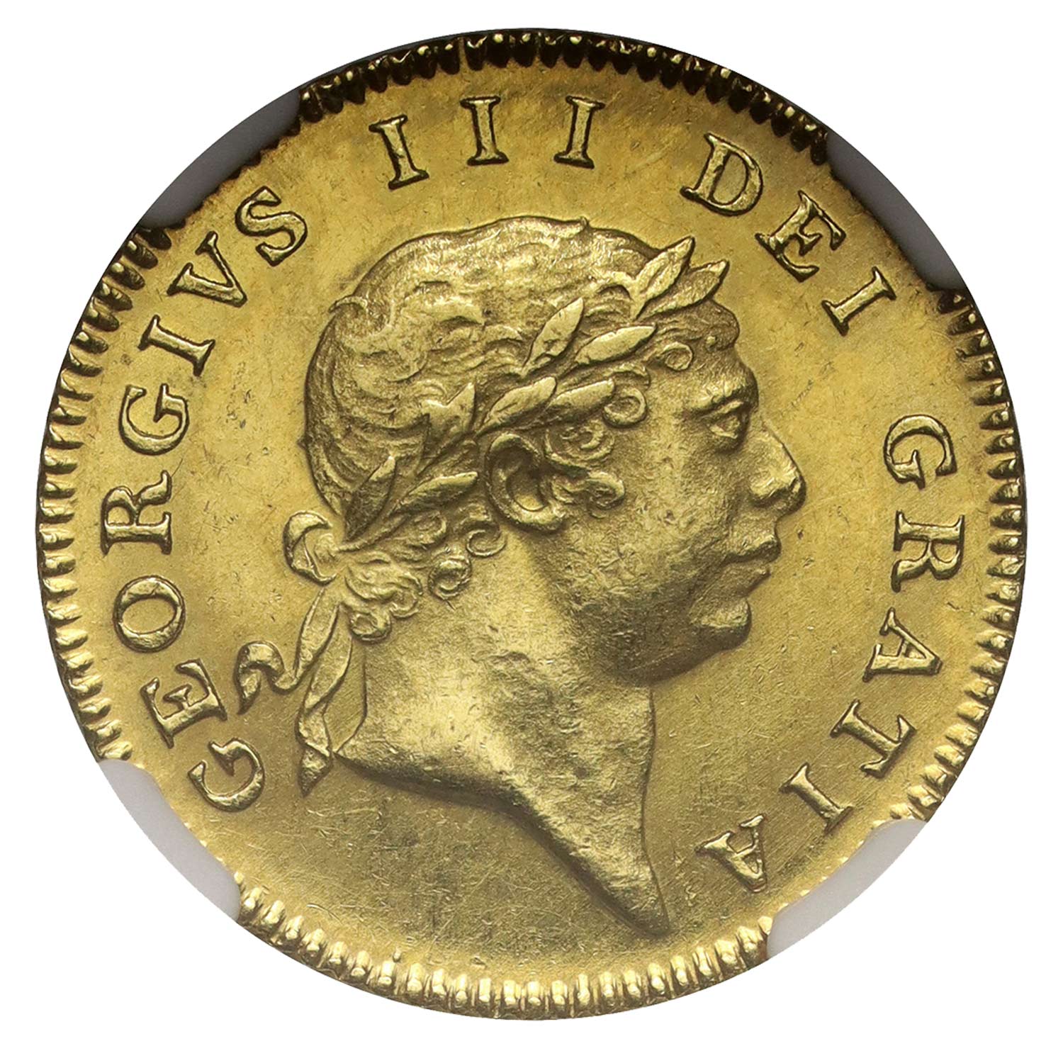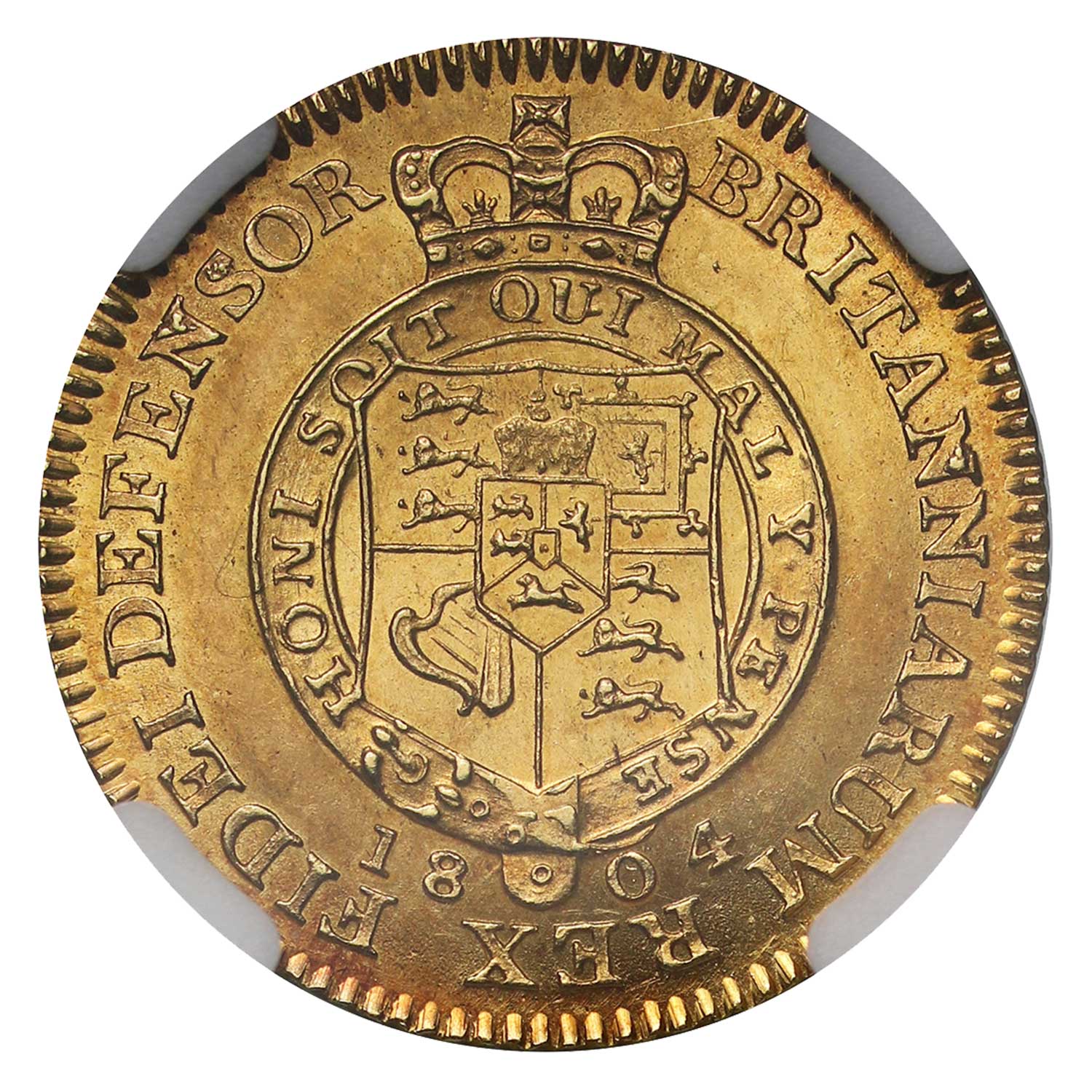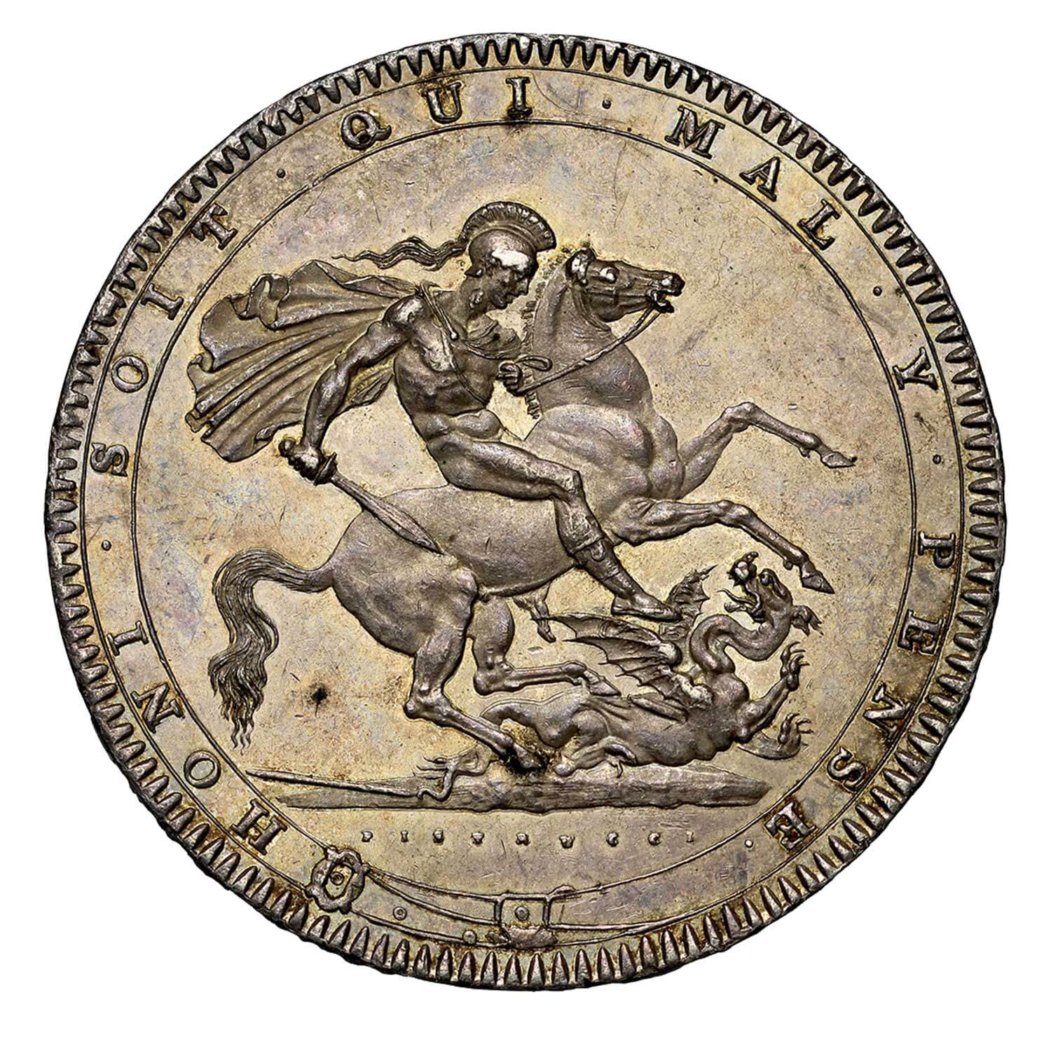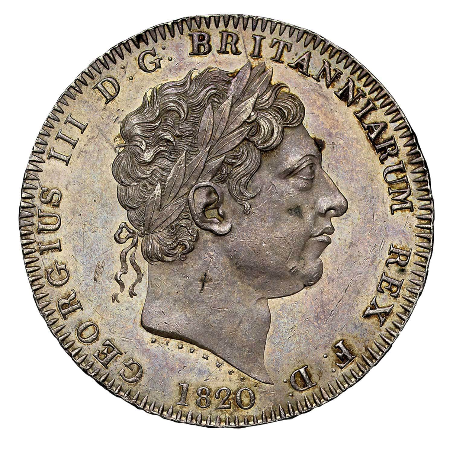 The Latin legend translates as on the obverse "George the Third, by the grace of God, King of the Britains, Defender of the Faith" and the French on the reverse, "Evil to him who evil thinks," additionally on the edge "An ornament and a safeguard, in the 60th year of the reign".