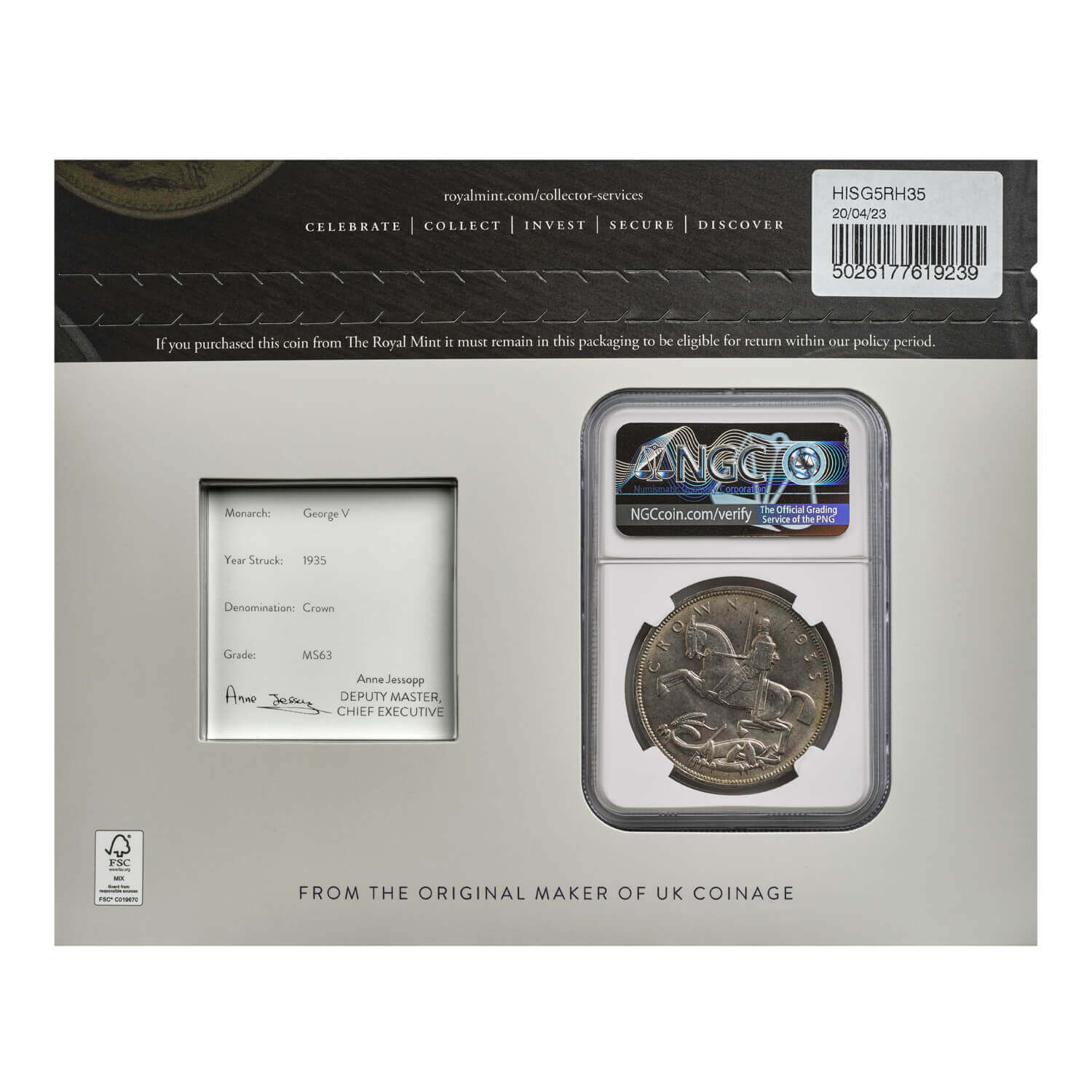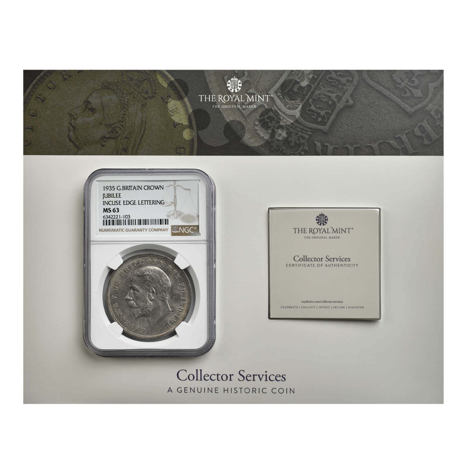 Crowns were issued regularly during the reign of George V but in 1935 a special design was released to commemorate his 25th year on the throne, his Silver Jubilee. The Silver Jubilee crown of 1935 was struck primarily in silver, but a very small number were produced in gold.