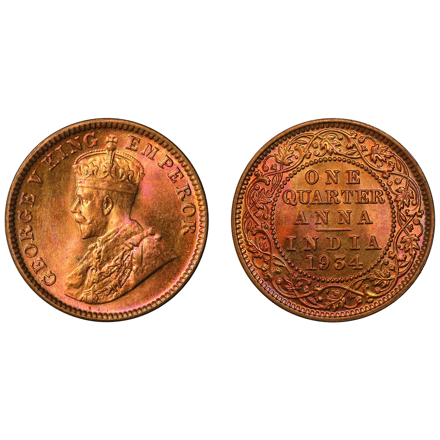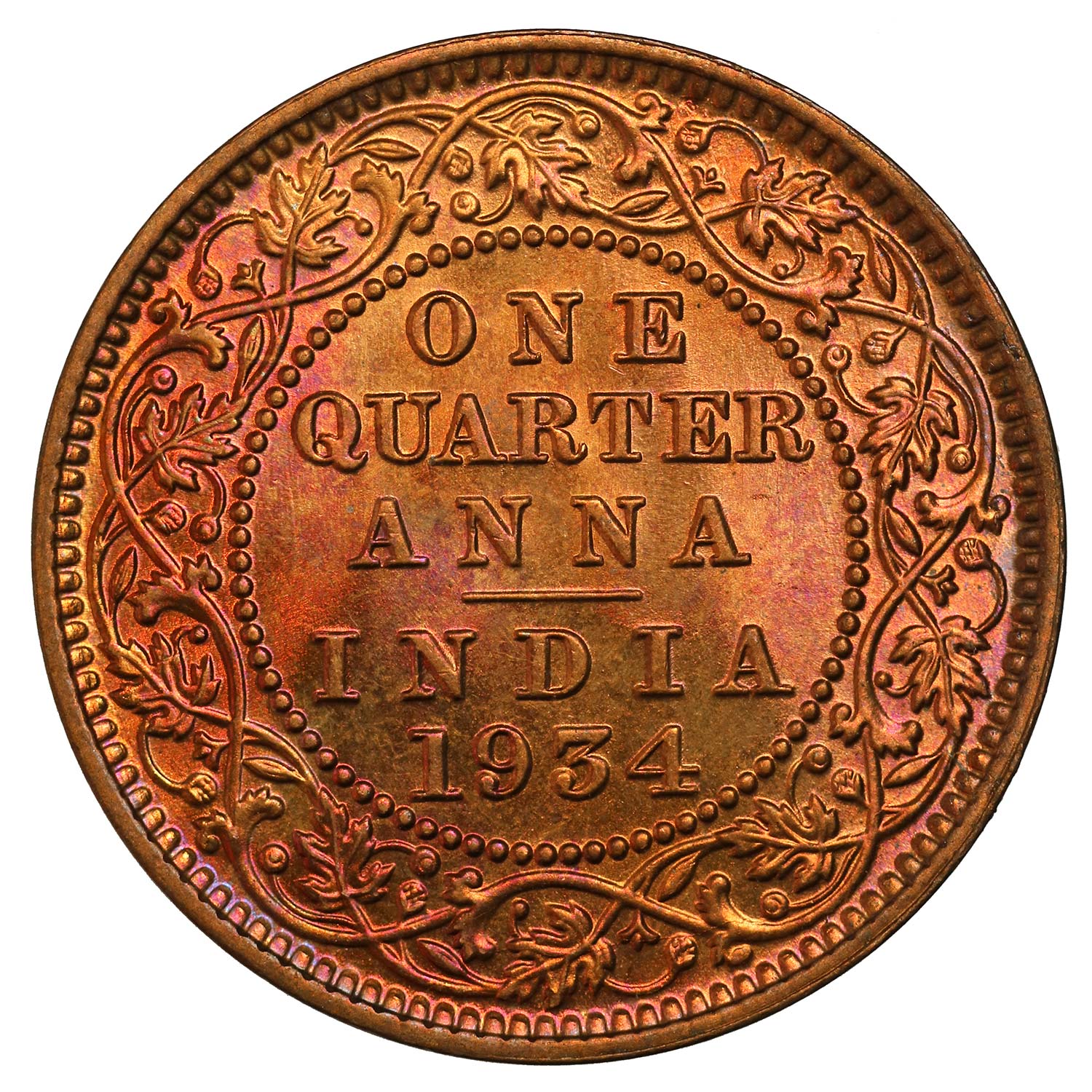 This Quarter Anna was produced by The Royal Mint during the reign of George V for use in India when it was part of the British Empire. Struck in 1934 in Copper this coin is in Brilliant Uncirculated condition and has a stunning mint-red appearance.