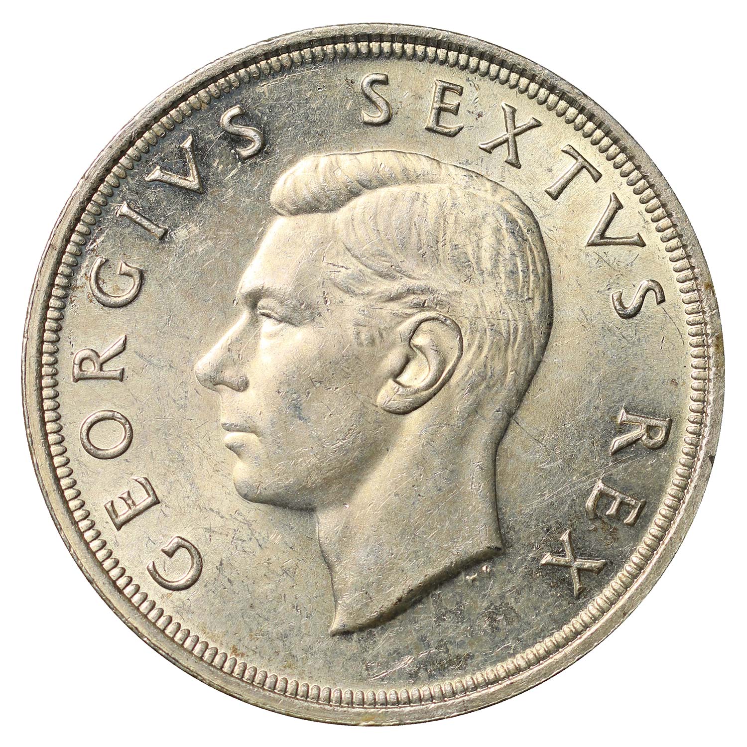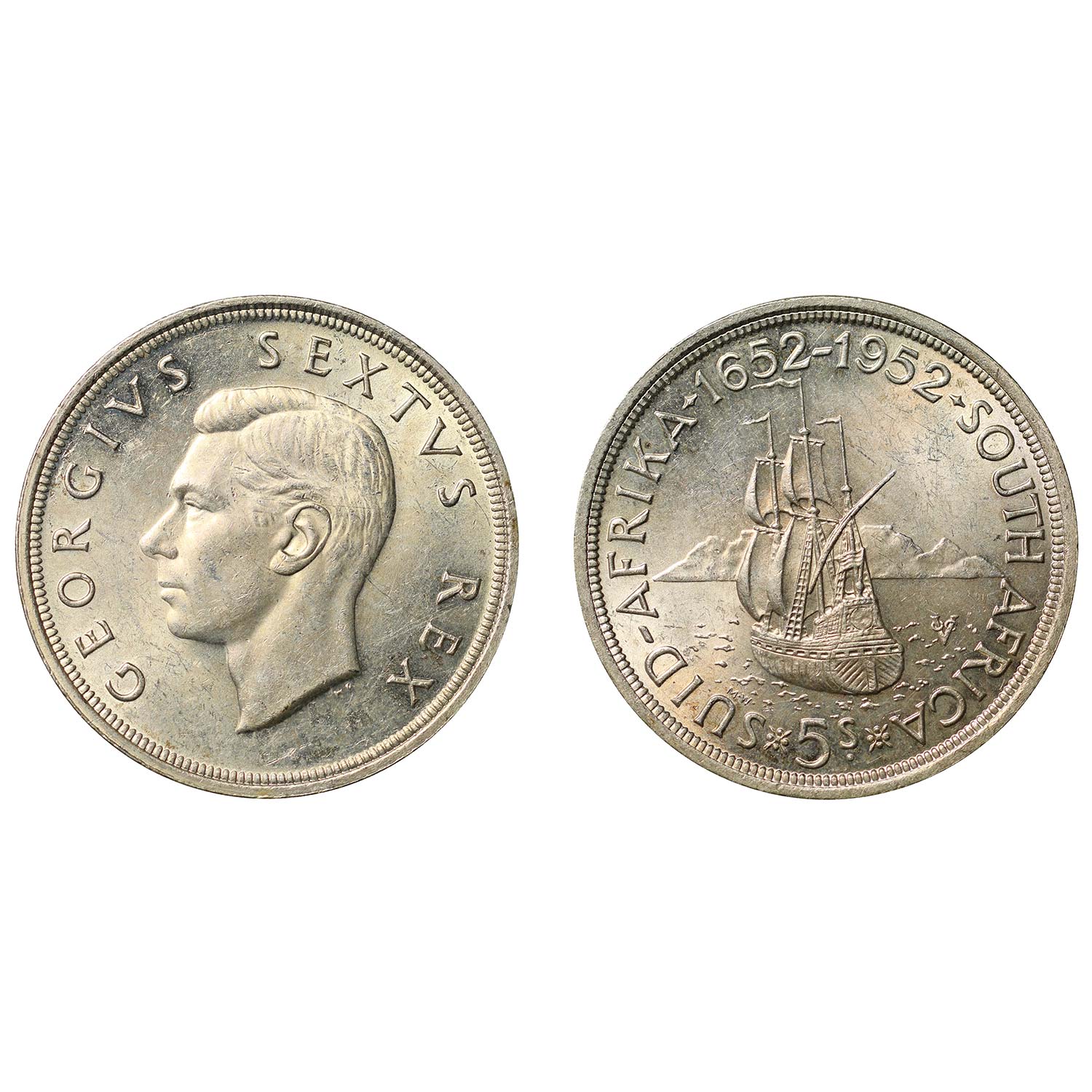 South Africa, George VI, Silver Five Shillings dated 1952. Obverse: George VI, Reverse: Schooner in harbour. Issued for 300th anniversary of the founding of Capetown (1652-1952) Edge: reeded. One year type.