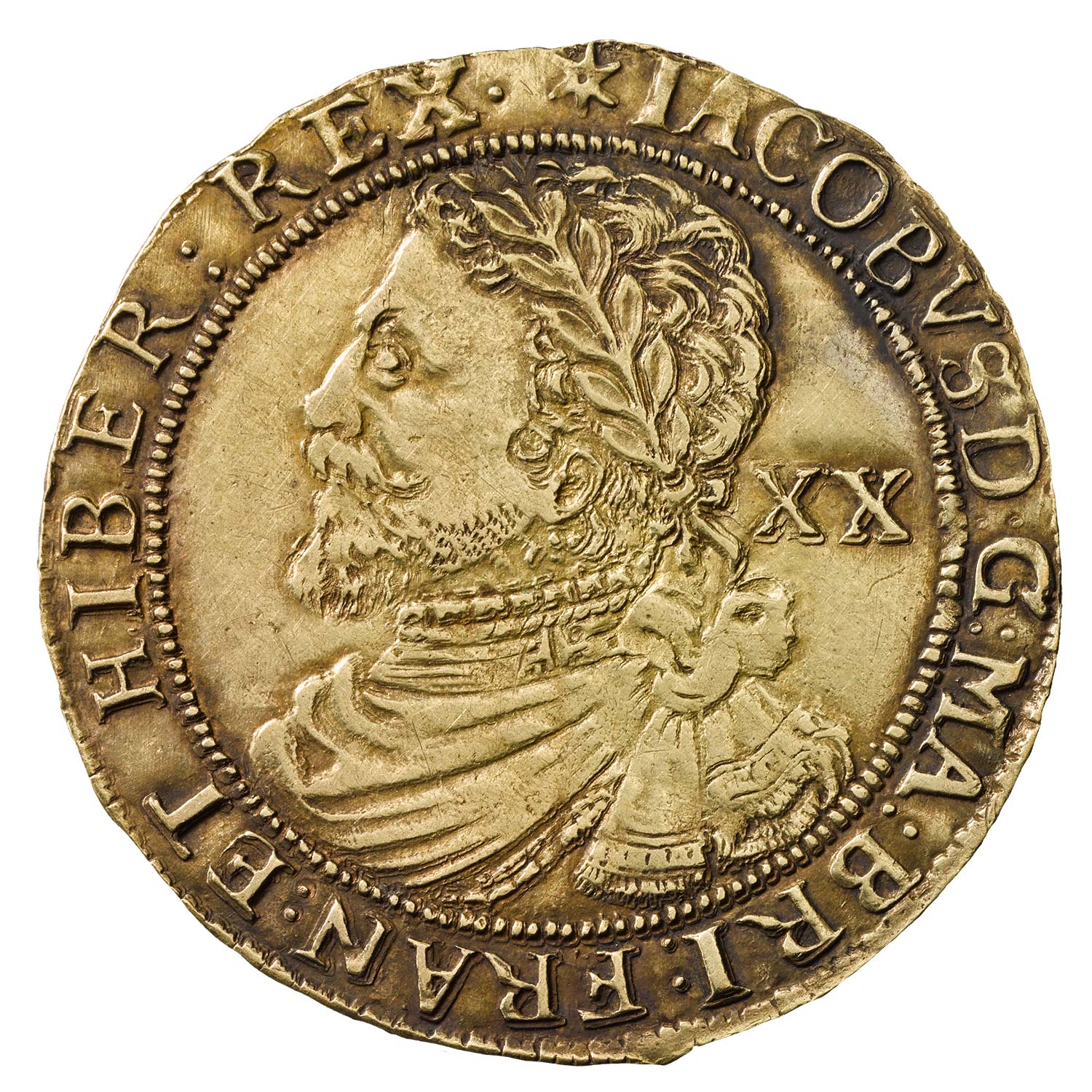 A Laurel is a gold coin which was worth 20 shillings and they were only struck during the reign of James I. Featuring the third bust of James I, this coin is a Spur Rowel Laurel which was the first variety of Laurel to be issued. The Spur Rowel mint mark was reserved exclusively for gold coins and indicates that a coin was struck between 20 August 1619 until 31 March 1620.