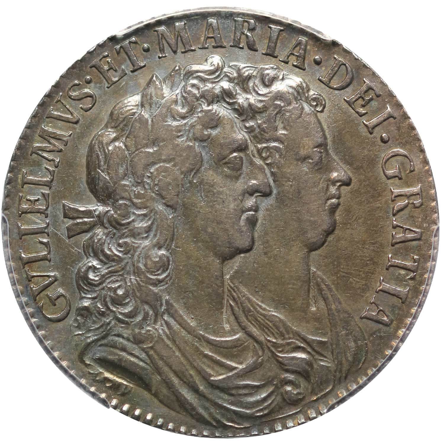 The Latin legends translate as on the obverse "William and Mary by the Grace of God," and abbreviated on the reverse as "King and Queen of Great Britain, France and Ireland." and additionally on the edge "An ornament and a safeguard, in the first year of the reign."