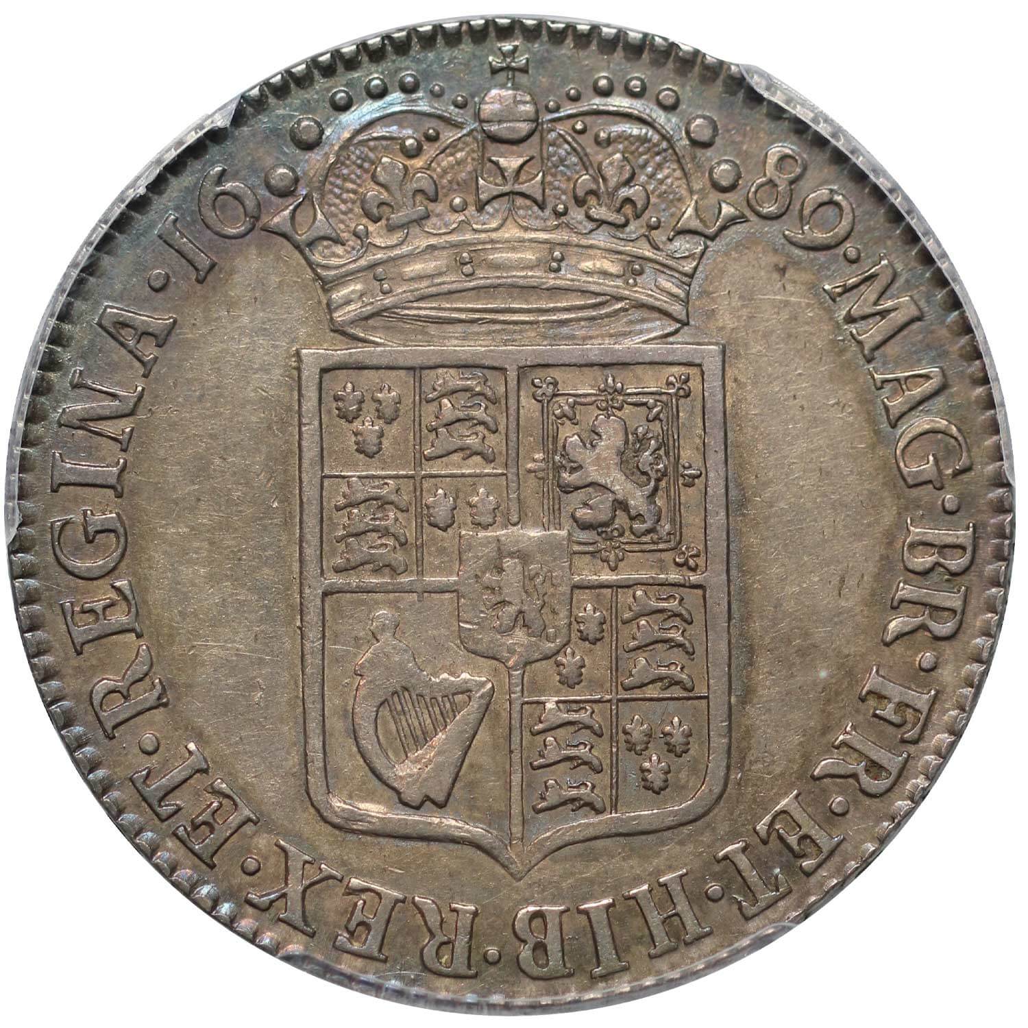 Reverse - Second crowned quartered shield of arms with an escutcheon of the Lion of Nassau, caul only frosted with pearls on crown band, date either side of crown, legend surrounding with inverted N in last word, .MAG. BR. FR. ET. HIB. REX. ET. REGINA., edge inscribed in raised letters, .+. DECVS. ET. TVTAMEN. ANNO. REGNI. PRIMO