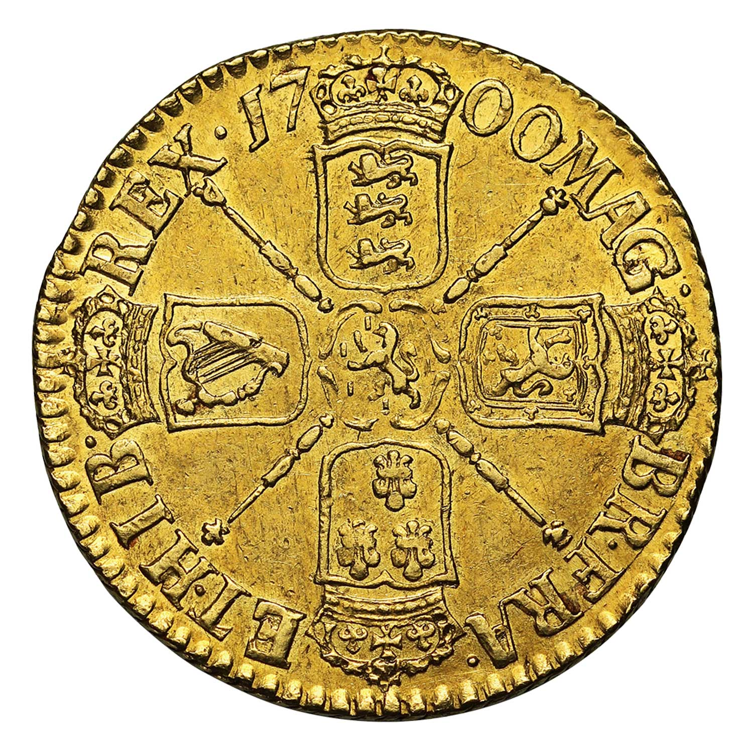 The Latin legends translate to on obverse "William the Third by the Grace of God" continuing on the reverse as "King of Great Britain, France and Ireland." We note £120,212 worth of gold for calendar year 1700 which is the lowest for gold production in the seven years of dates in this reign, though of course we do not know how the output would be broken down between the gold denominations nor how long a date on a coin die would have lasted into a following calendar year.