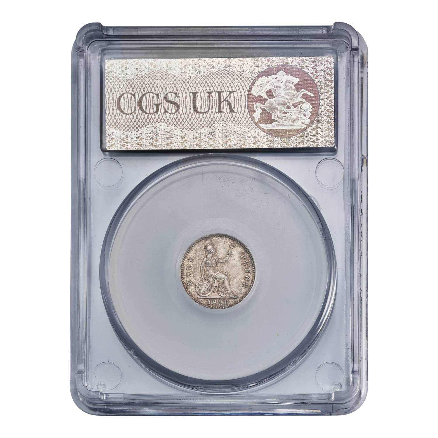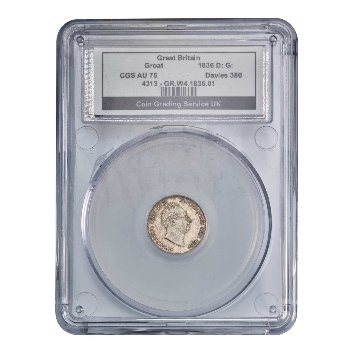This William IV Groat is year-dated 1836 and has been graded as AU75. The obverse features the coinage portrait of William IV designed by the legendary William Wyon RA. The reverse features a design of a seated Britannia facing to the right, holding a trident and a shield.