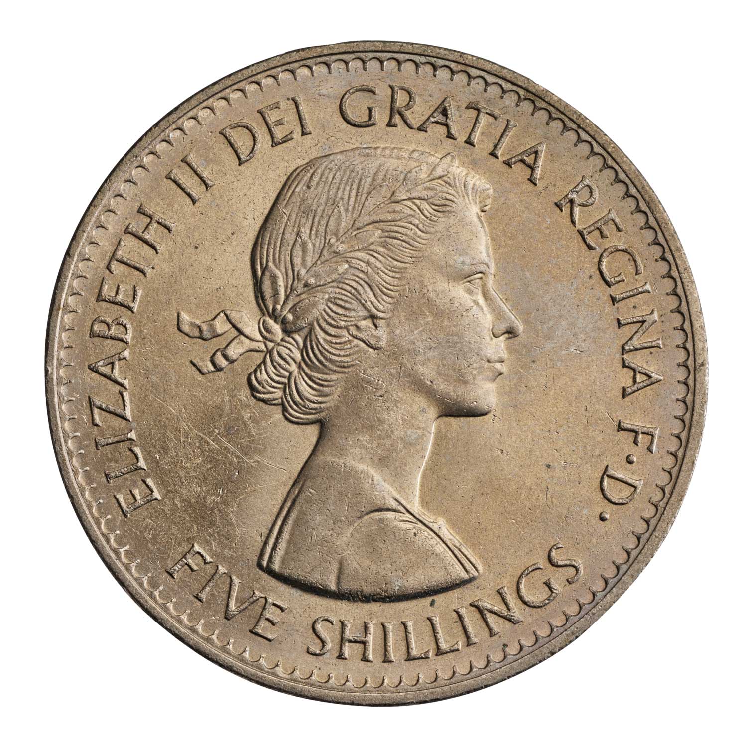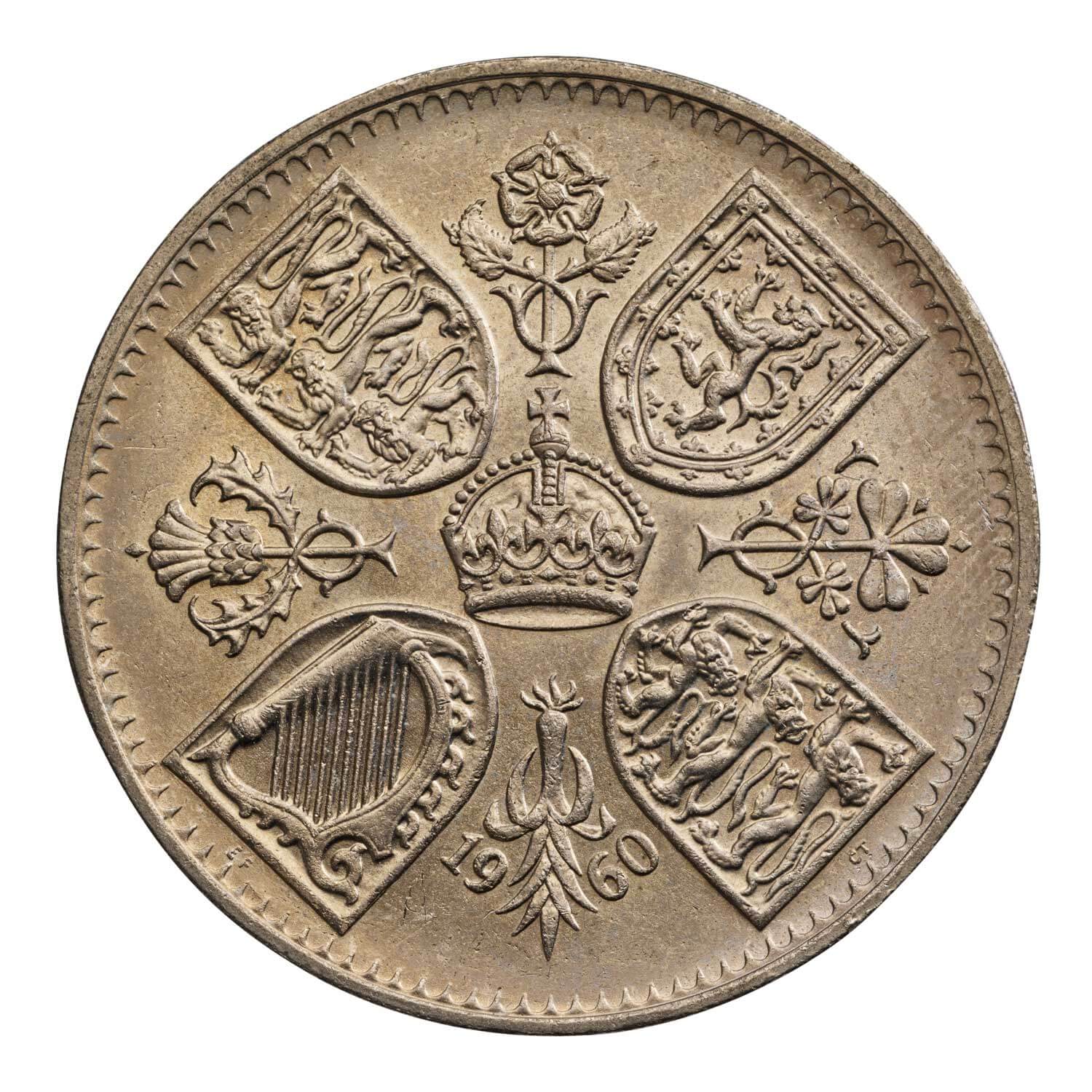 This 1960 year-dated crown features the historic reverse design that first appeared on the coronation crown issued in 1953 by Edgar Fuller and Cecil Thomas. The obverse features the first coinage portrait of Queen Elizabeth II designed by Mary Gillick. This 1960 crown is in a minimum of Extremely Fine condition.