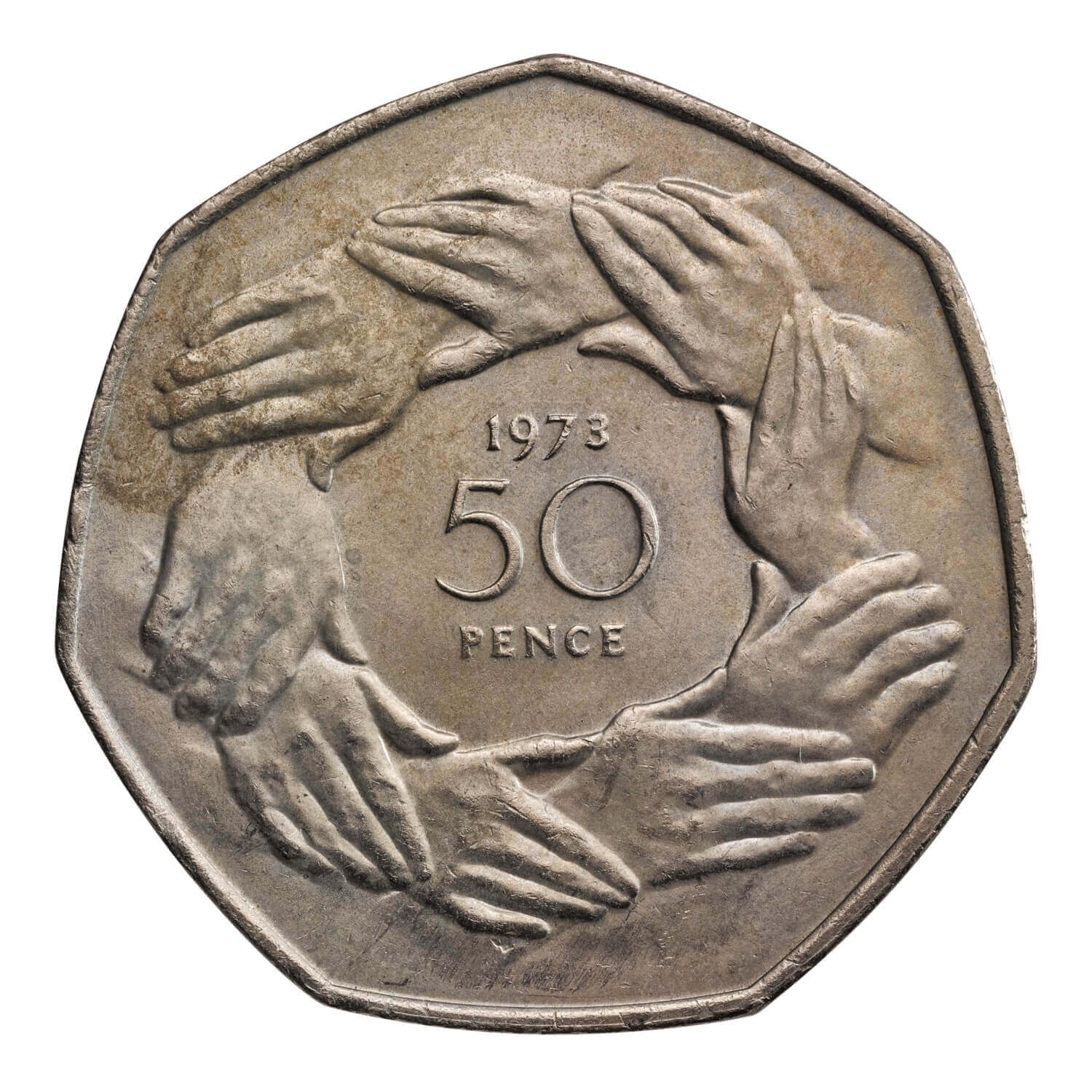 The 1973 50p coin was the first commemorative coin issued in the UK following decimalisation. It was created to mark the United Kingdom's accession to the European Economic Community (EEC).