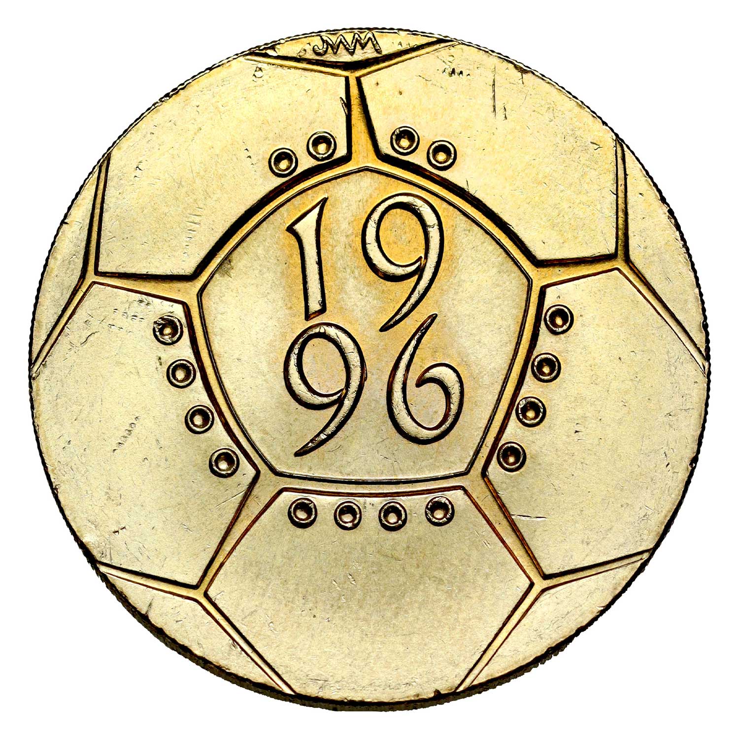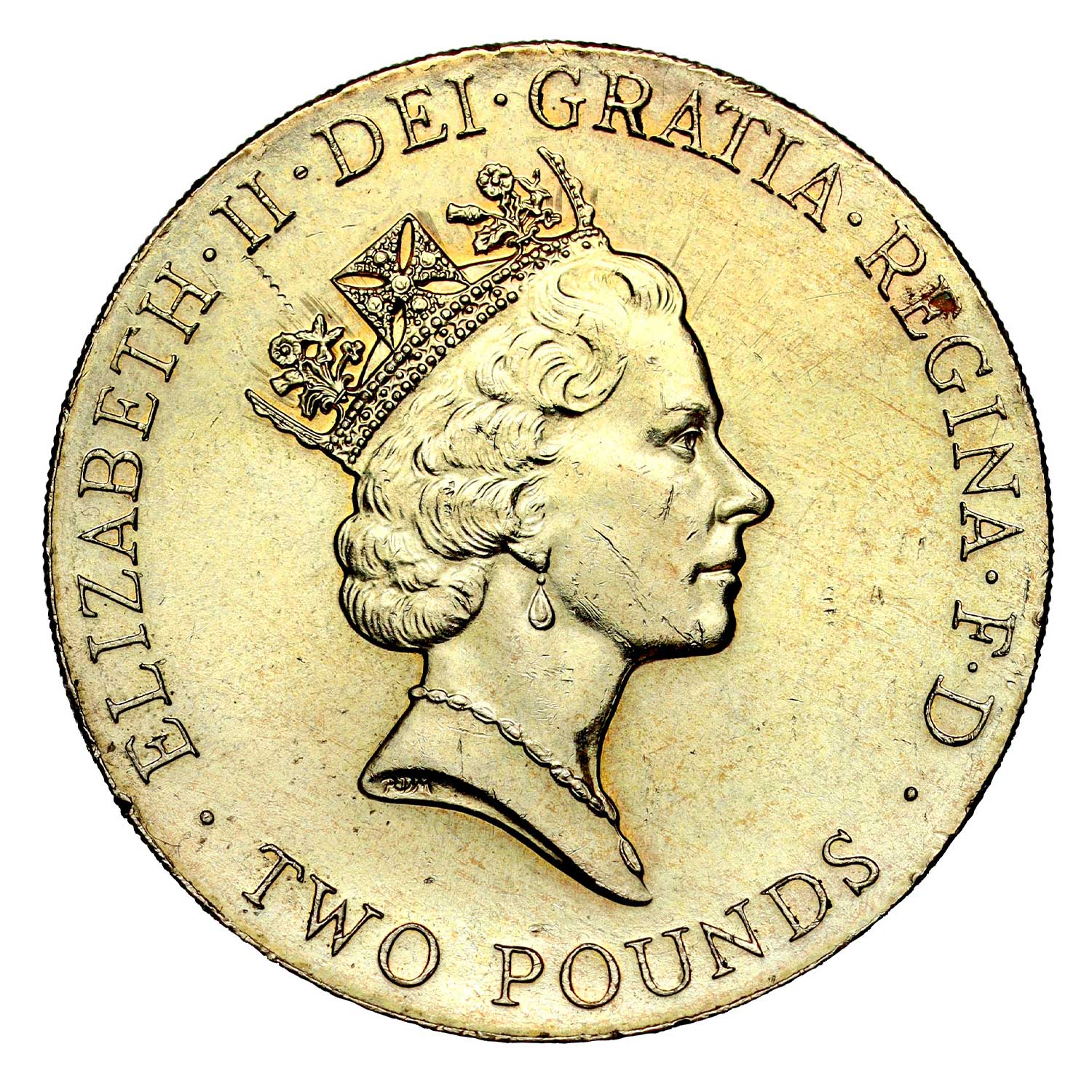 Elizabeth II (1952 - 2022), Currency Two-Pounds, 1996, for the European Football Championships, crowned bust right, RDM incuse on truncation for designer Raphael Maklouf, Latin legend and border surrounding, .ELIZABETH. II. DEI. GRATIA. REGINA. F. D., with TWO POUNDS below bust, the planchet slightly dished both sides, rev. stylised representation of a football with the date 1996 centrally placed and surrounded by sixteen small rings, JMM monogram at top for designer John Mills, edge milled with incuse inscription + TENTH EUROPEAN CHAMPIONSHIP. Extremely fine quality.