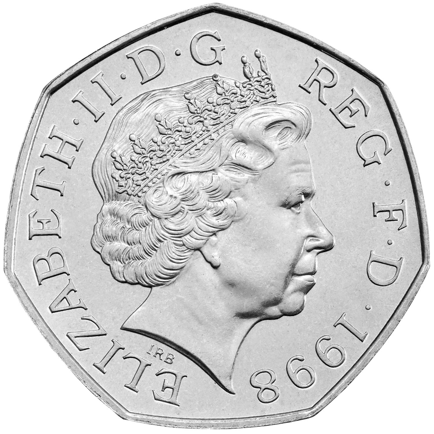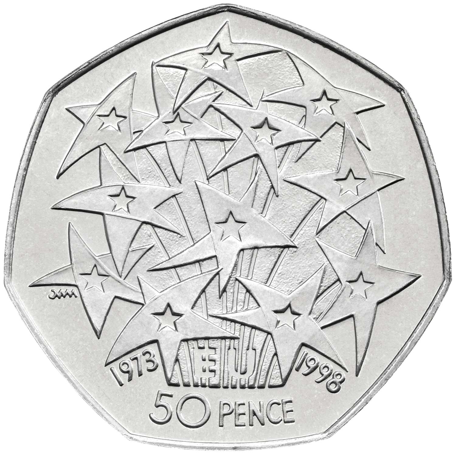 To commemorate the United Kingdom's 25th anniversary of membership in the European Union and its Presidency of the Council of Ministers, the Royal Mint issued a special 50p coin in 1998. The reverse design, created by John Mills, features the twelve stars of the European Union encircling the letters "EU," flanked by the dates "1973" and "1998." Below this is the denomination, "50 PENCE," symbolizing both the anniversary and the UK's role in the EU.