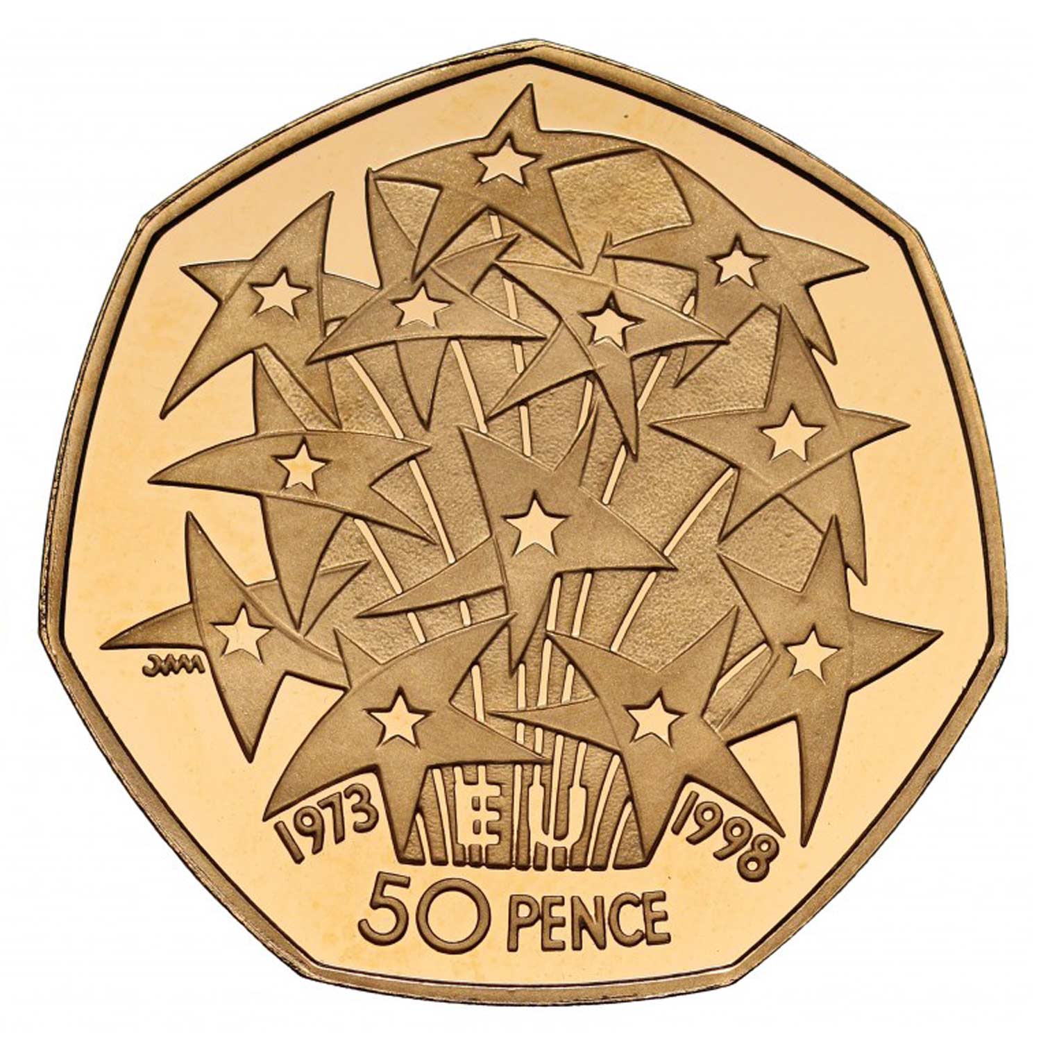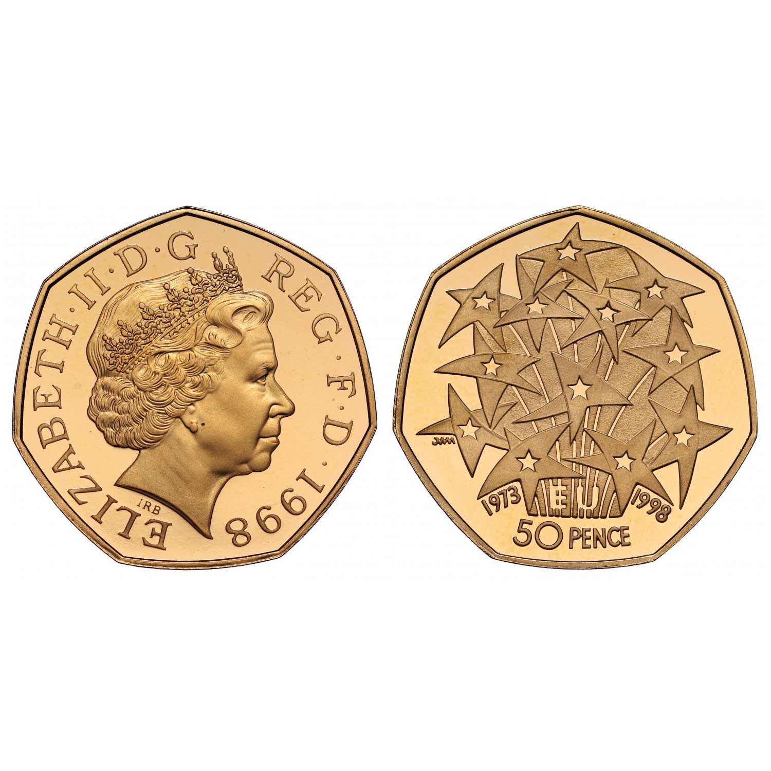 The reverse of the coin depicts a celebratory pattern of twelve stars reflecting the European flag with the dates 1973 and 1998 and the letters E U and a value of 50 PENCE.