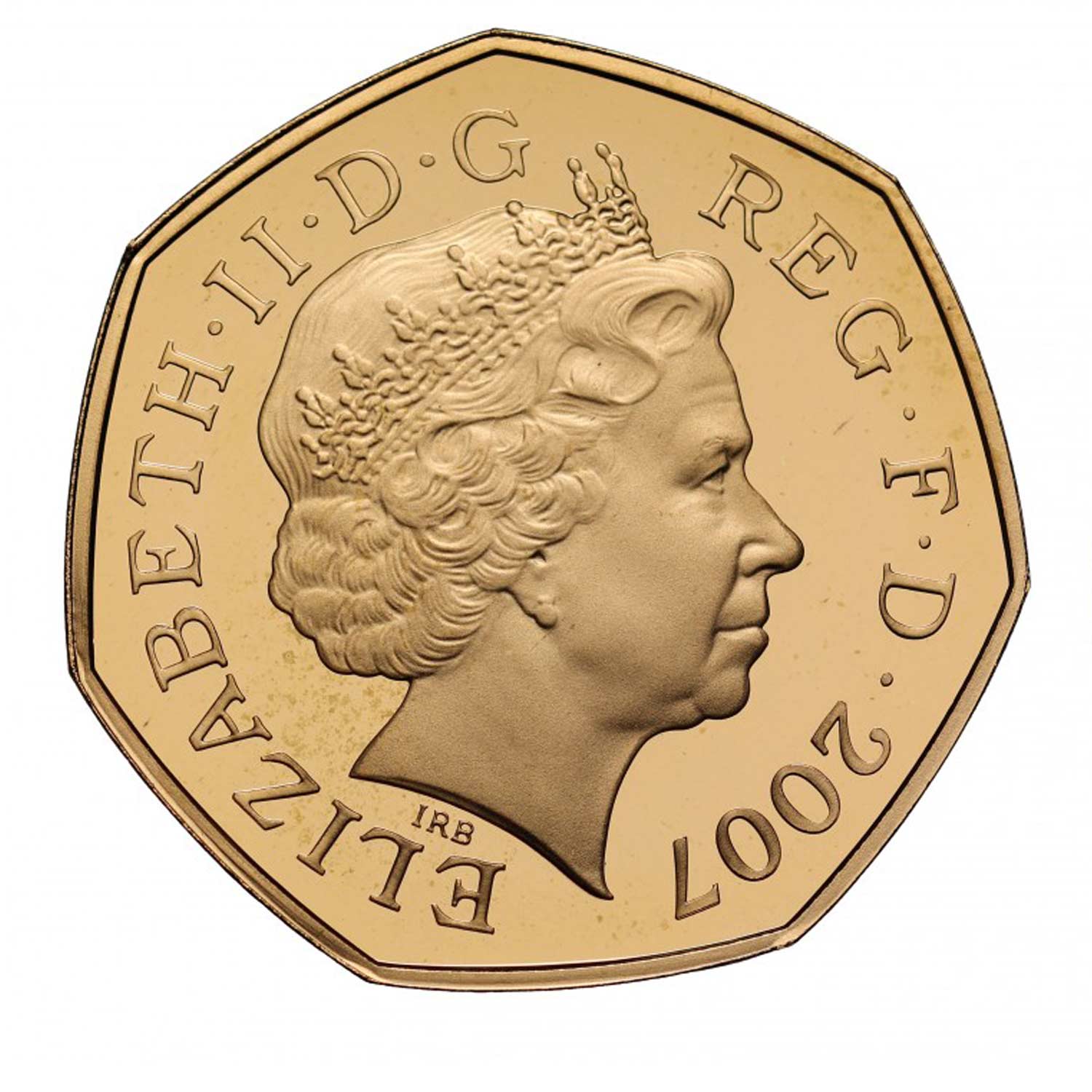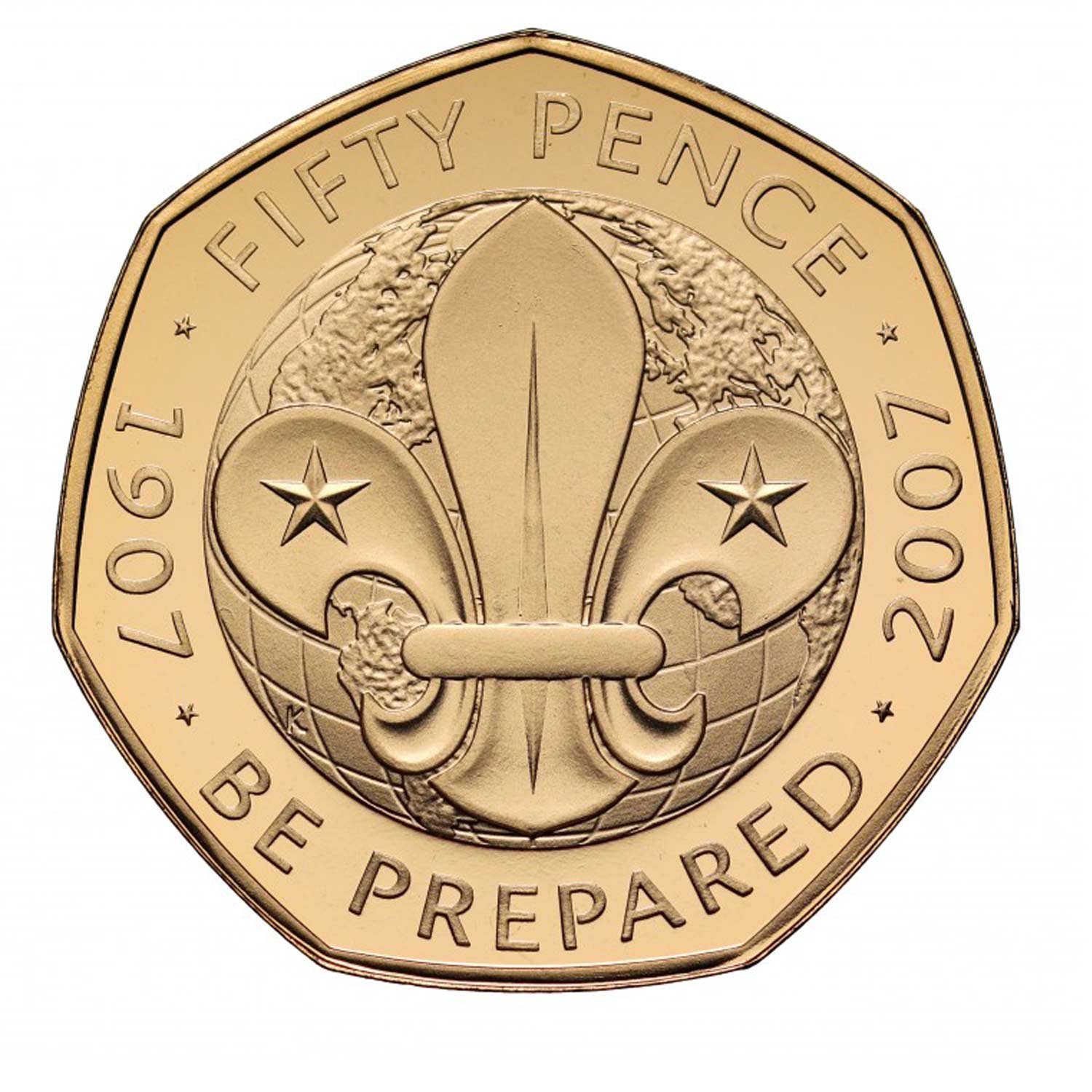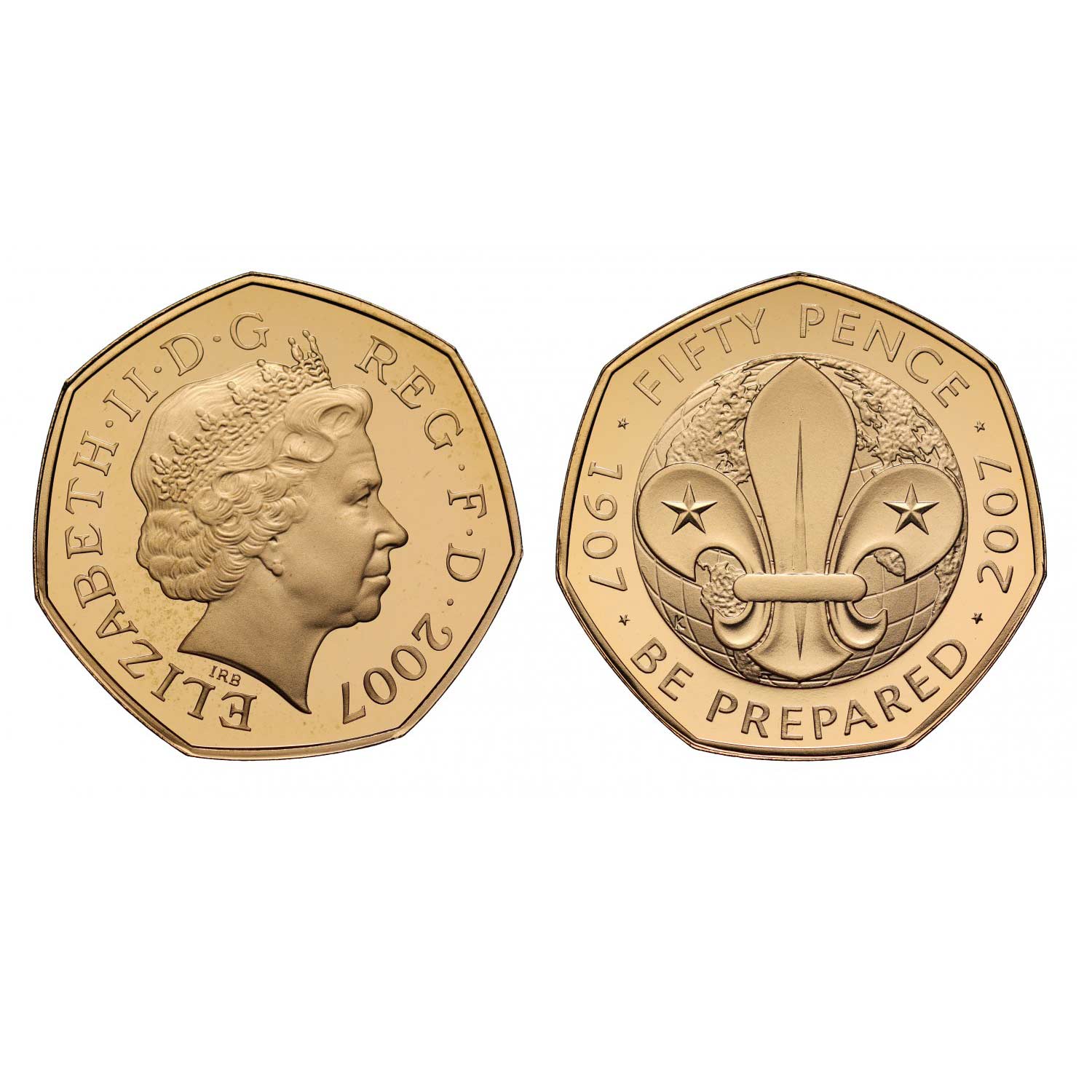 Elizabeth II (1952 -), gold proof Fifty-Pence, 2007, struck in 22 carat gold for the 100th Anniversary of the founding of the Scouting Movement, crowned bust right, IRB below for designer Ian Rank Broadley, Latin legend surrounding, ELIZABETH II D. G. REG. F. D.2007, rev. design by Kerry Jones of a Fleur de Lis of the Scouting Movement superimposed over a globe FIFTY PENCE 1907 BE PREPARED 2007, 15.5g (S.H17). As struck, lustrous mint state, in original Royal Mint box with certificate of authenticity.