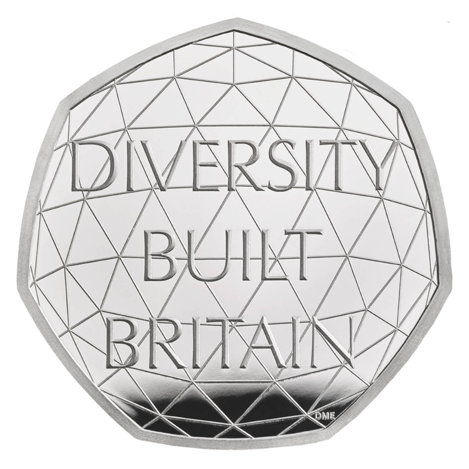 “The background of the coin features a geodome with a series of interconnecting lines and triangles that form a network. Each part is equal, and symbolises a community of connection and strength. The words ‘DIVERSITY BUILT BRITAIN’ talks about the differences between us, and the connection which gives us unity. The design also looks to the future, how we can connect, develop bonds and grow stronger together.”