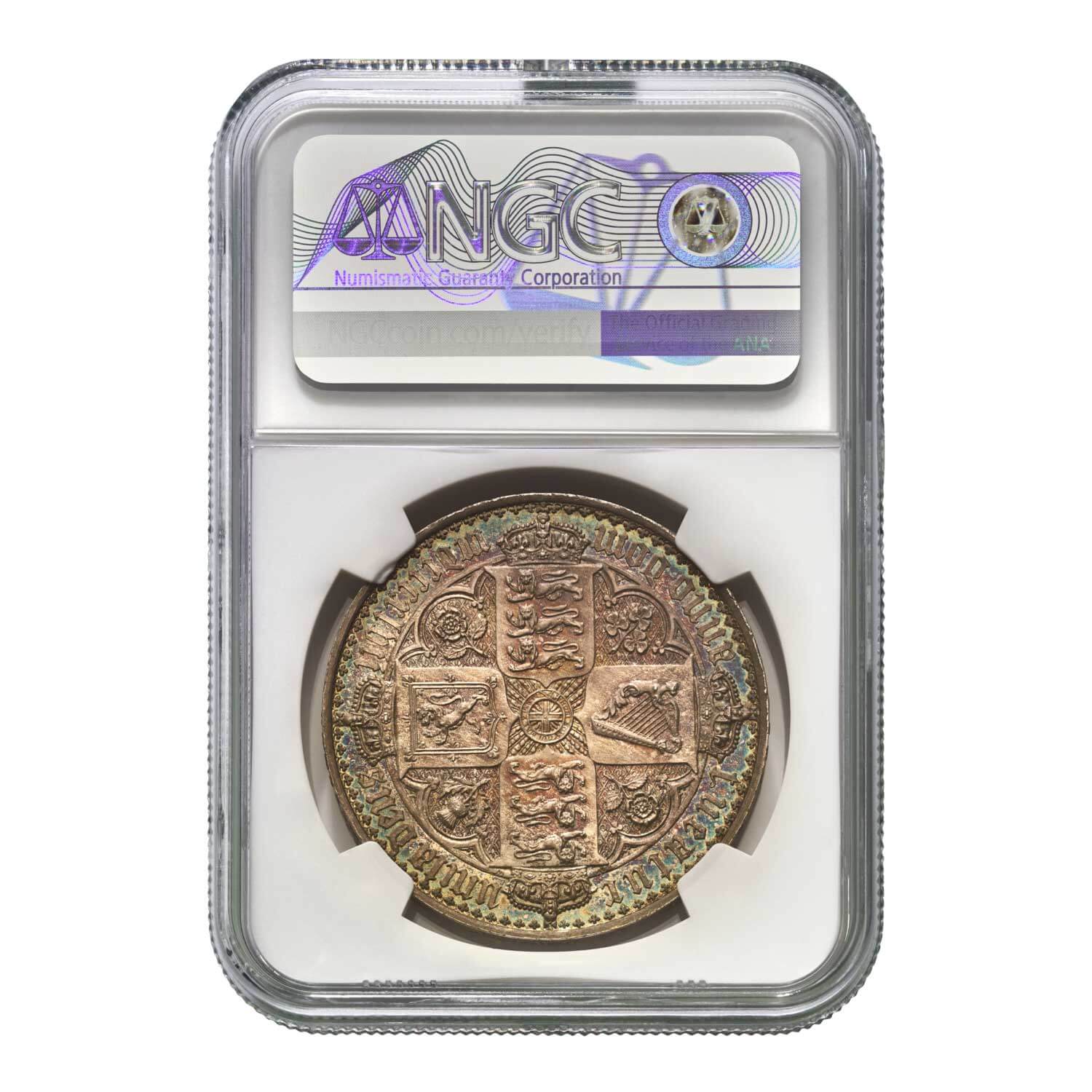 One of the most spectacular designs for a silver coin in the entire British Milled series the Proof Gothic Crowns with lettered edge were limited to a mintage of only 8,000 pieces. William Wyon (1795-1851) was the Royal Academy engraver responsible and was at the peak of his career having also designed the equally impressive gold "Una and the Lion" Five Pound pieces dated 1839 also in Roman numerals.