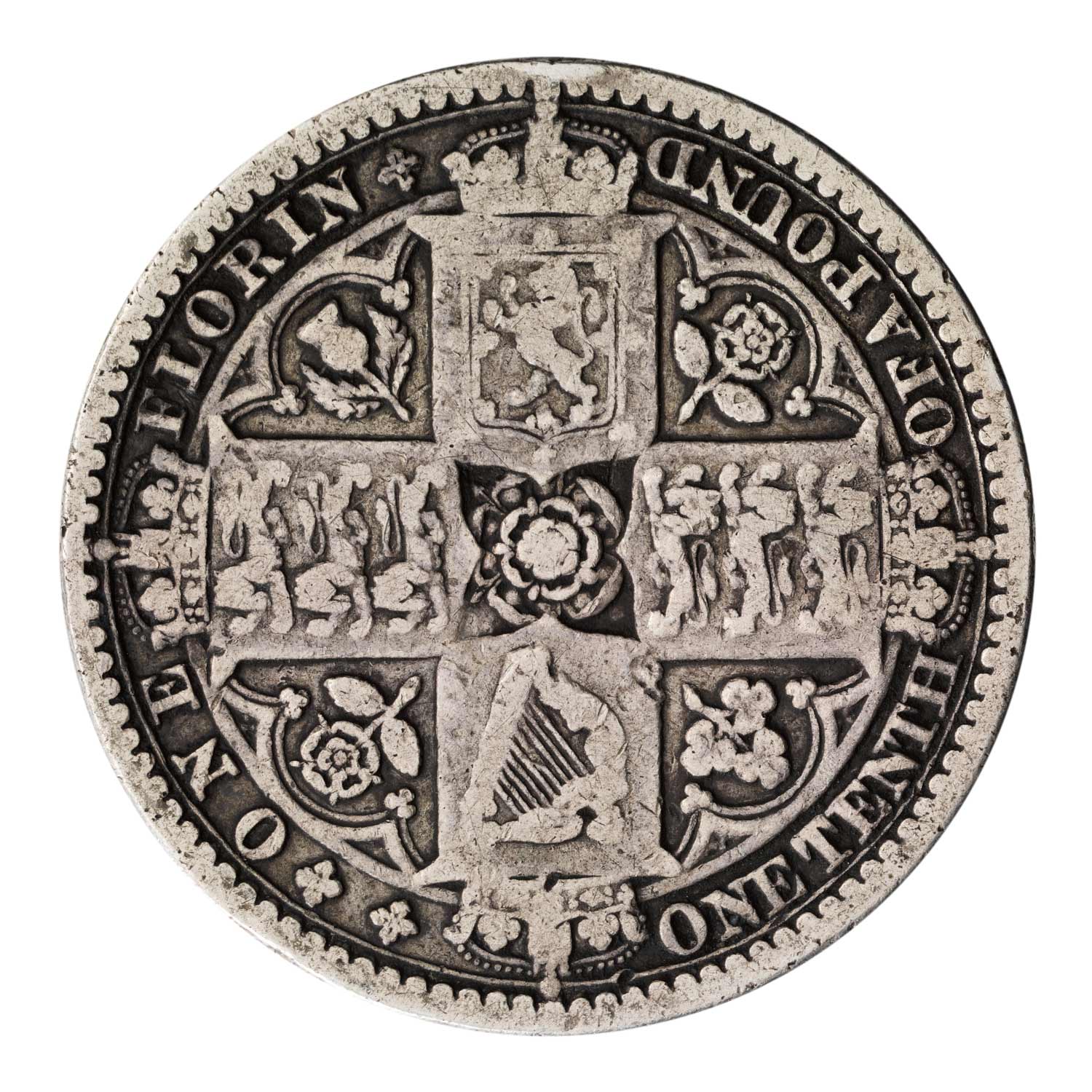 Four crowned cruciform shields bearing a harp represent Ireland; a lion rampant represents Scotland while three lions passant represent England. The centre of the coin shows a Tudor rose, and a legend around the edge of the coin reads "ONE FLORIN ONE TENTH OF A POUND".