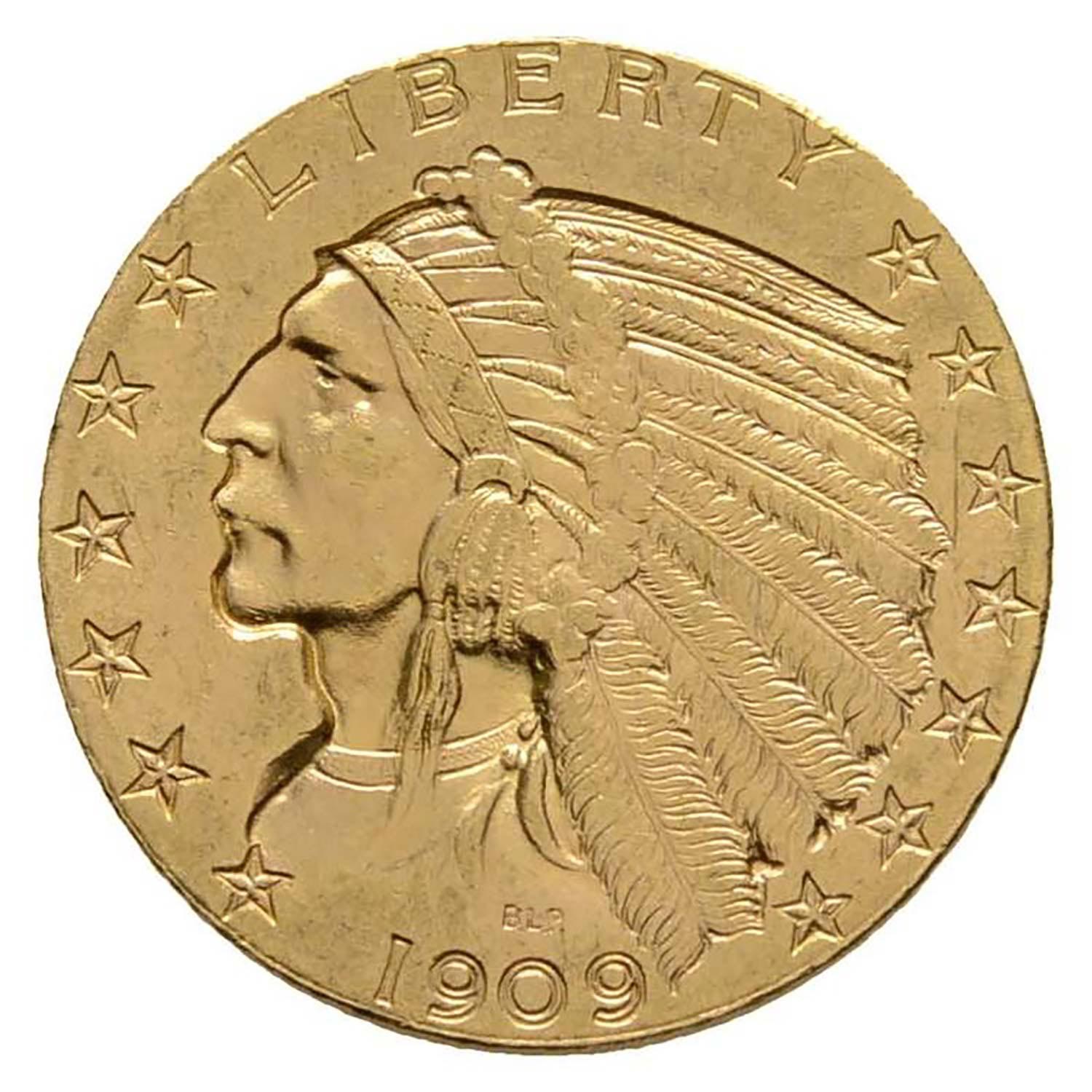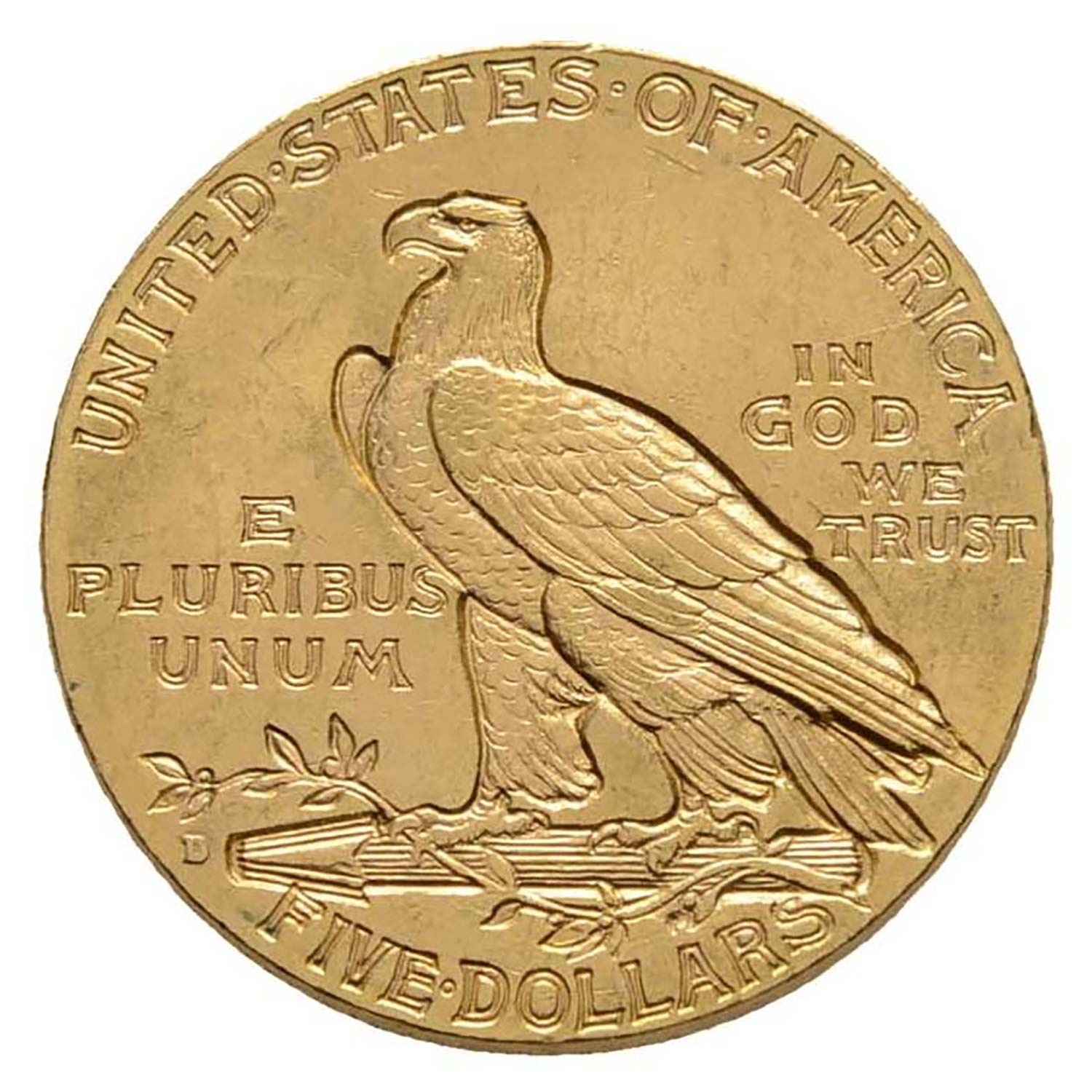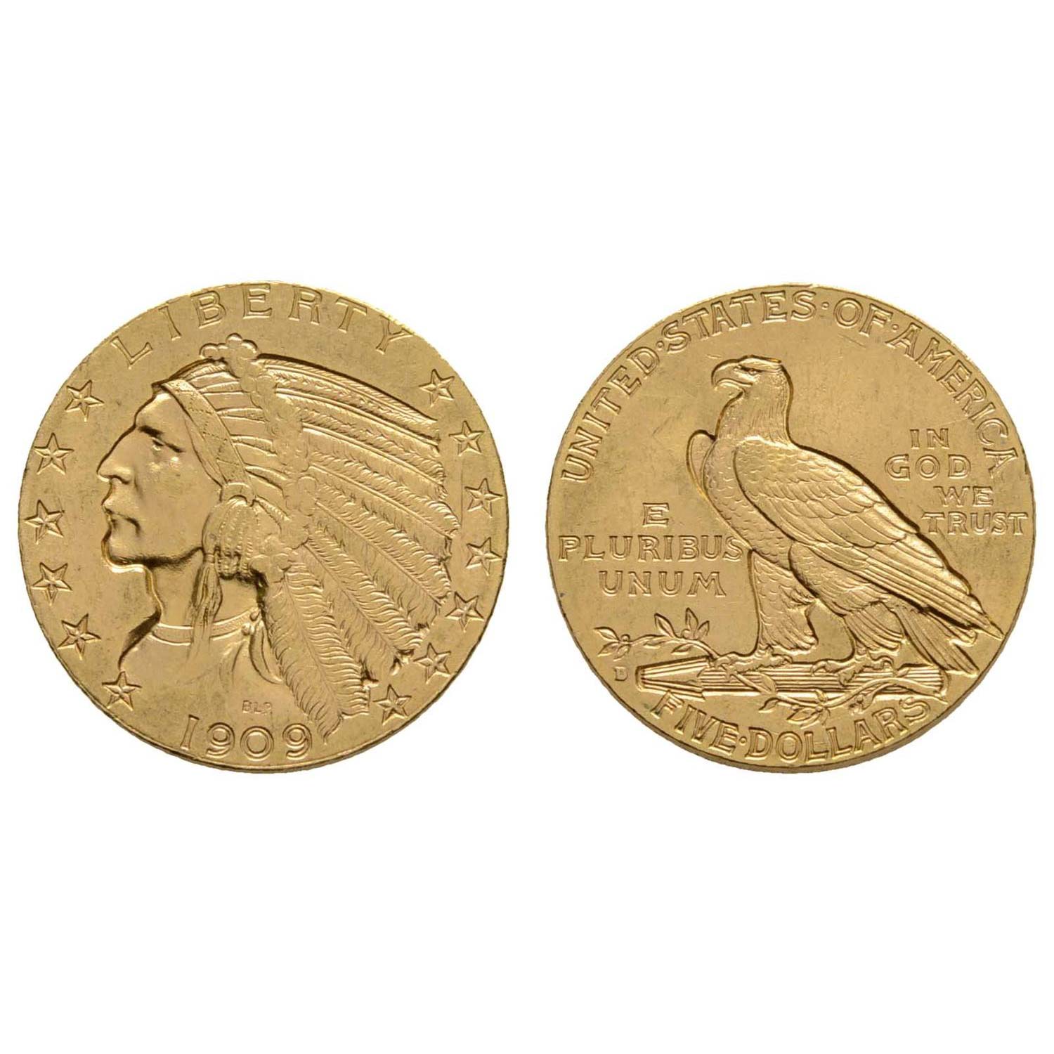 United States Gold 5 Dollars, Indian Head design on obverse, IN GOD WE TRUST next to eagle on reverse. Made of 0.900 fine gold which equates to 21.6 Carats today.