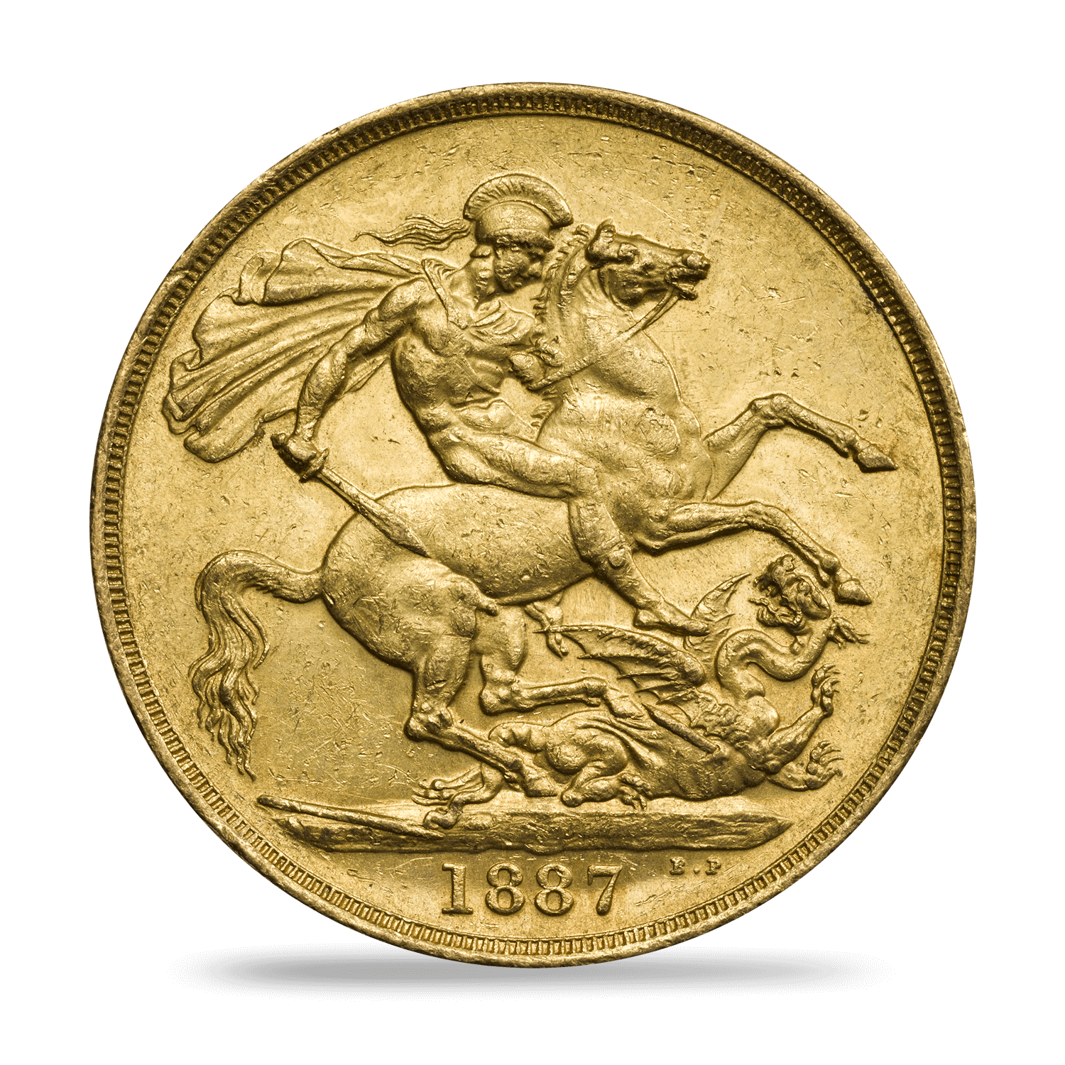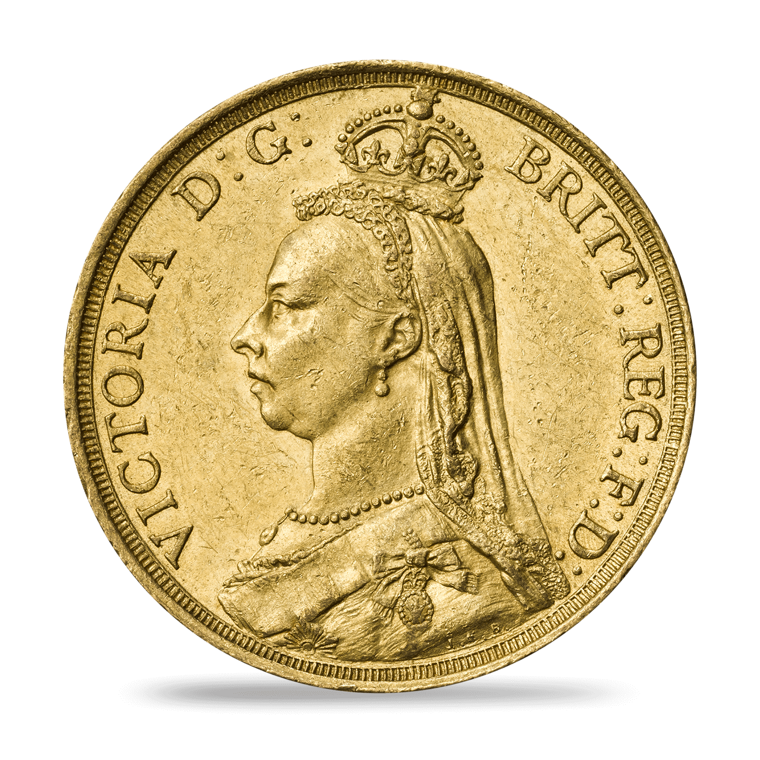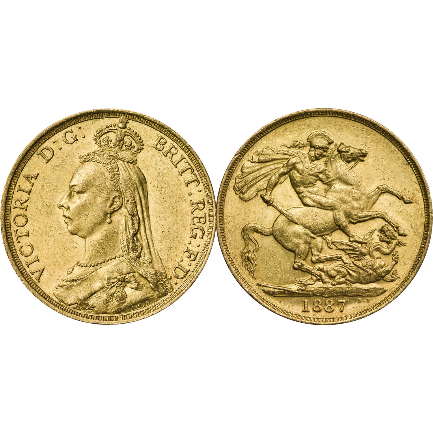 In that Jubilee year, a new coinage portrait of The Queen was introduced, created by Sir Joseph Edgar Boehm who depicted The Queen with a small crown. It would become known as the 'Jubilee head'. This prestigious Double-Sovereign was struck in that golden year.