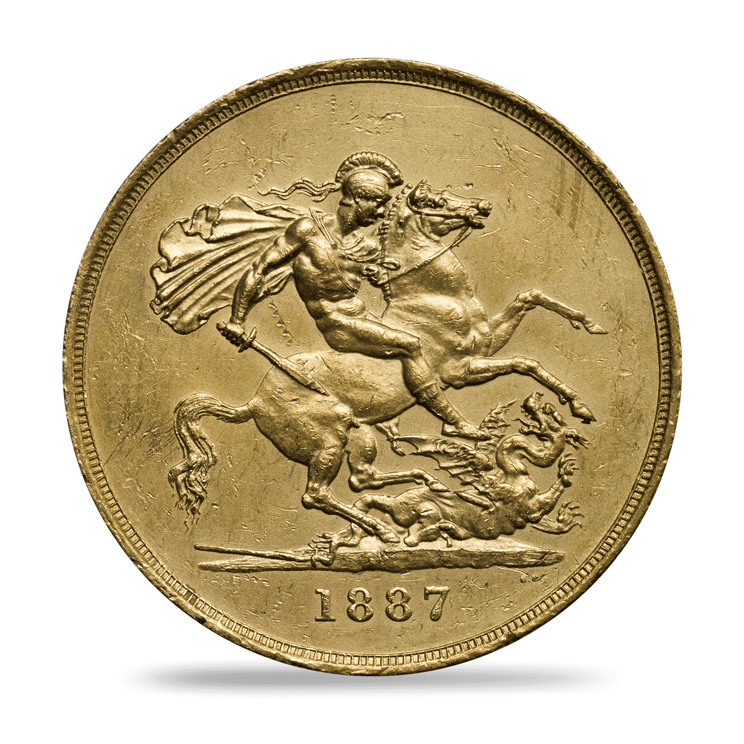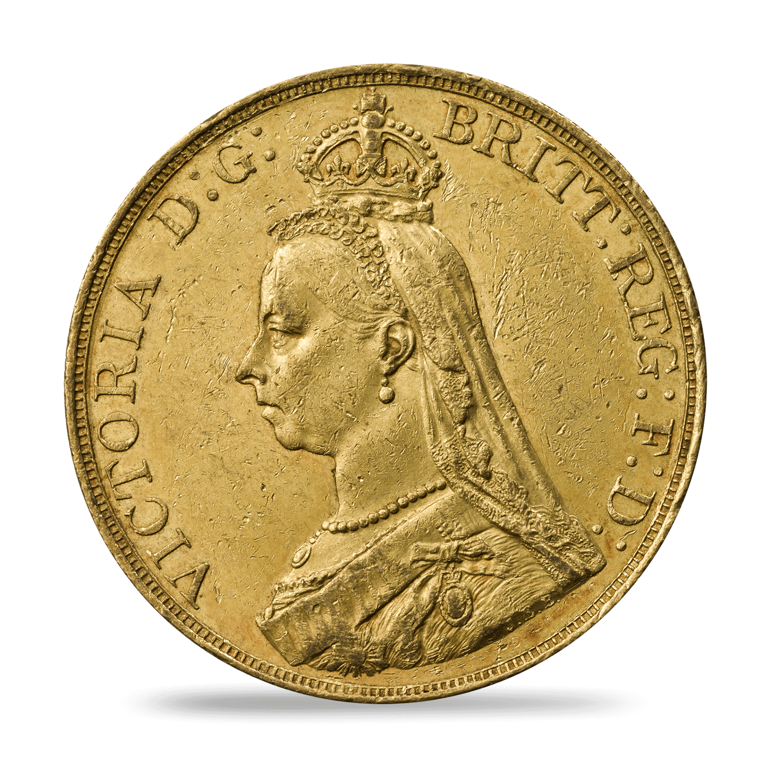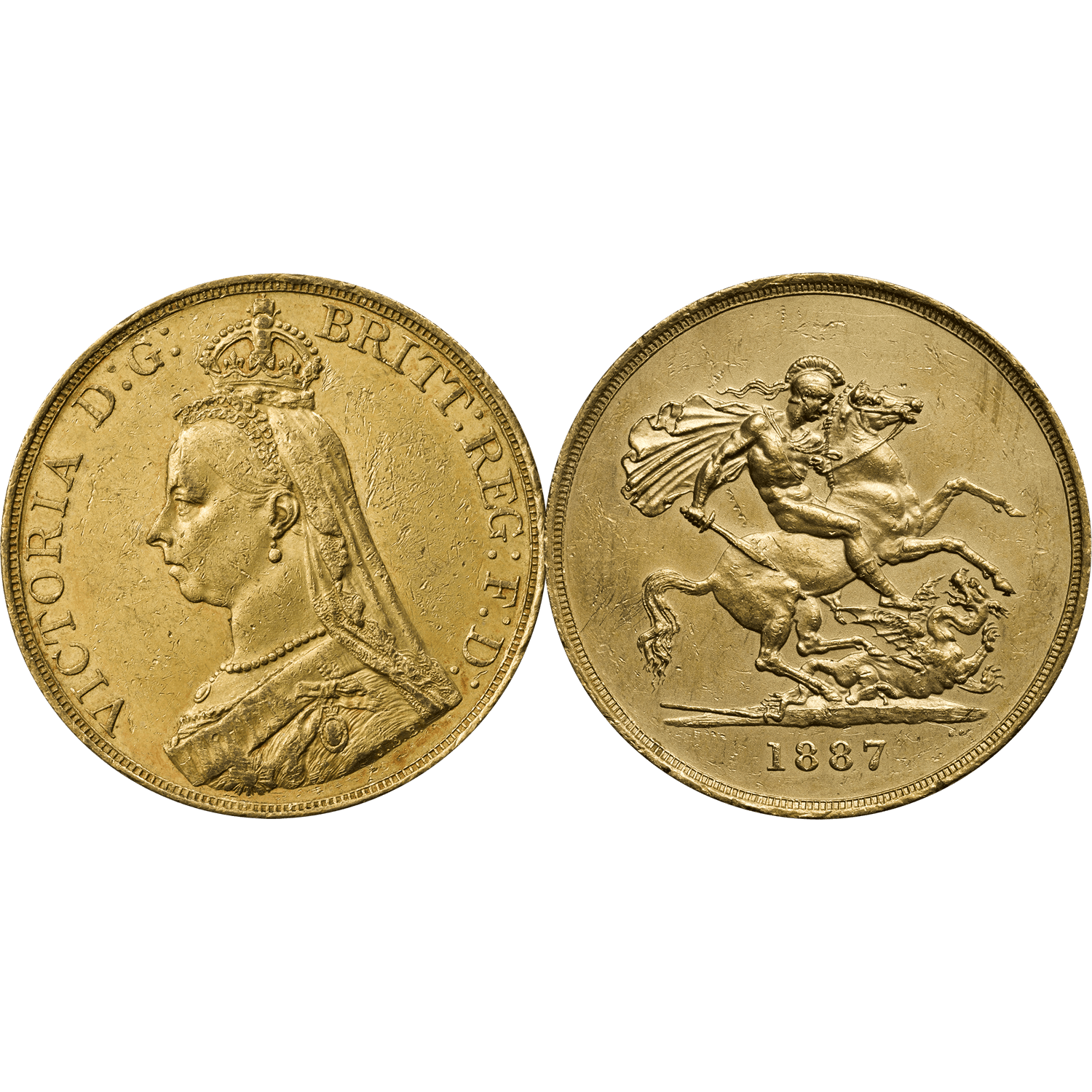 In that Jubilee year, a new coinage portrait of The Queen was introduced, created by Sir Joseph Edgar Boehm who depicted The Queen with a small crown. It would become known as the 'Jubilee head'. This prestigious Five Sovereign piece was struck in that golden year.