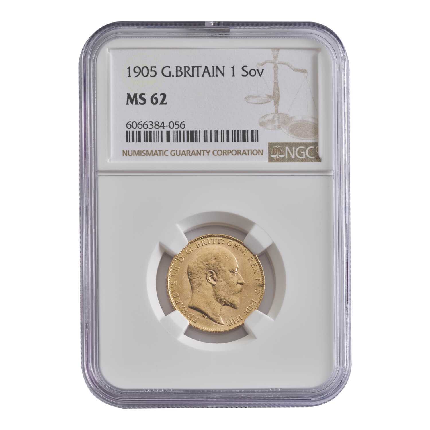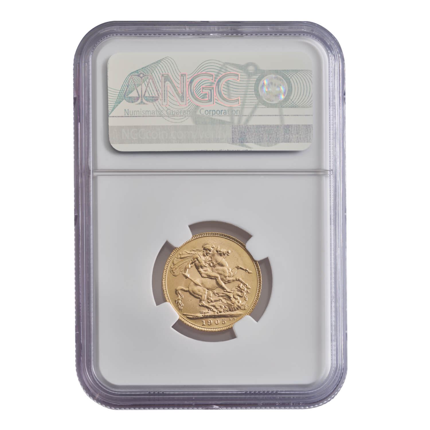 Although Edward became king in 1901, his first coins were not struck until 1902. This original Sovereign, struck in 1905, features Benedetto Pistrucci's St George and the dragon on the reverse. The obverse features the portrait of the king, by George William de Saulles.