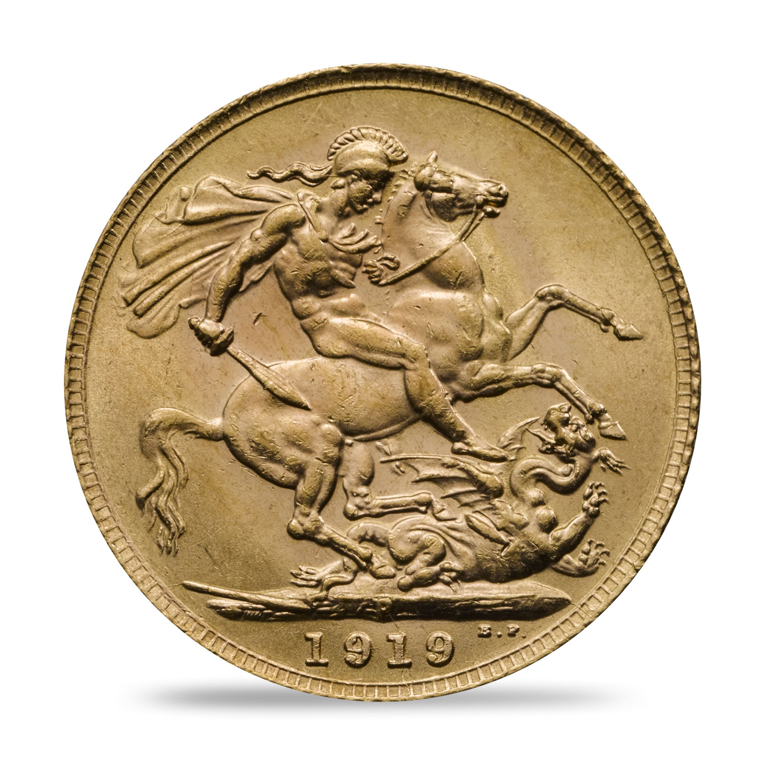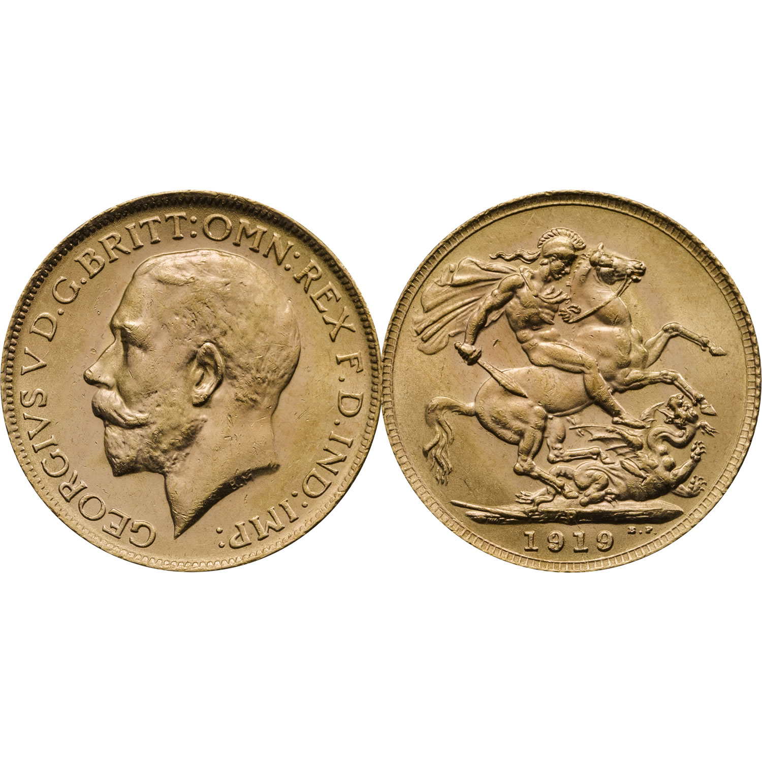 In 1919 Sovereigns were manufactured in four branch mints: Sydney, Melbourne and Perth in Australia, and in smaller numbers in Ottawa, Canada. Distinguished by their own unique mint mark placed beneath Benedetto Pistrucci’s classic St George and the dragon design, they feature the portrait of George V by Bertram Mackennal on the obverse.