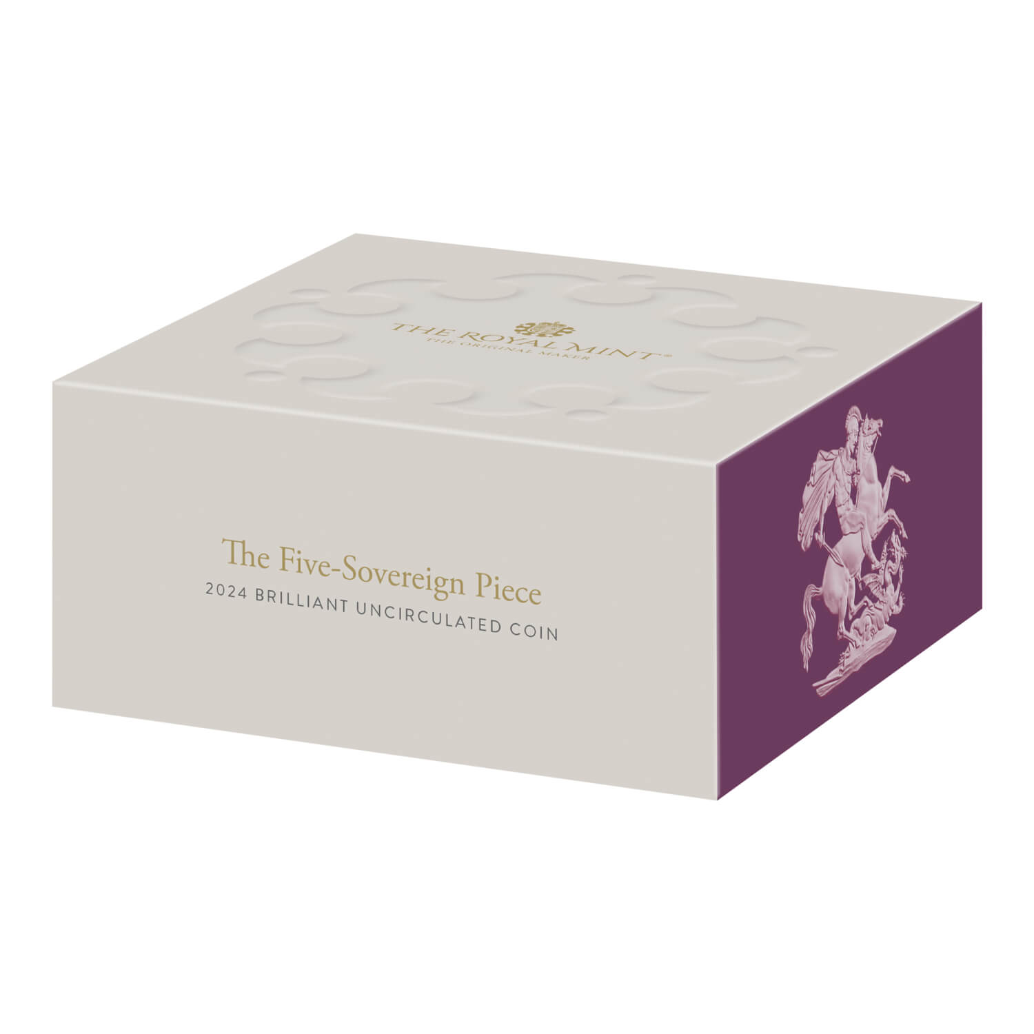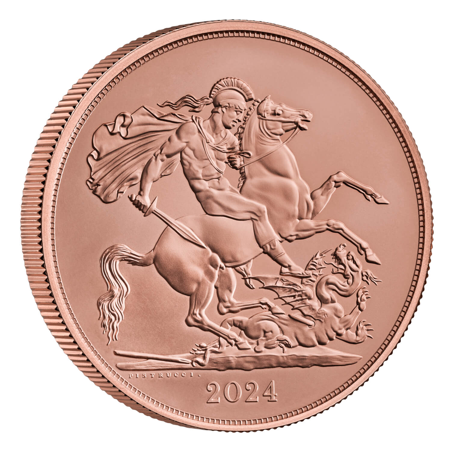 The 2024 Brilliant Uncirculated Five-Sovereign Piece has been struck in 22 carat gold and features a contemporary Matt finish. The obverse displays the first definitive coinage portrait of King Charles III, designed by Martin Jennings, making the 2024 Sovereign collection the first to feature both Benedetto Pistrucci’s St George and the dragon design with the first definitive coinage portrait of His Majesty King Charles III. The coin comes with a detailed booklet highlighting the history of The Sovereign, the beginning of a new Carolean era, and the life and work of the Italian engraver Benedetto Pistrucci.