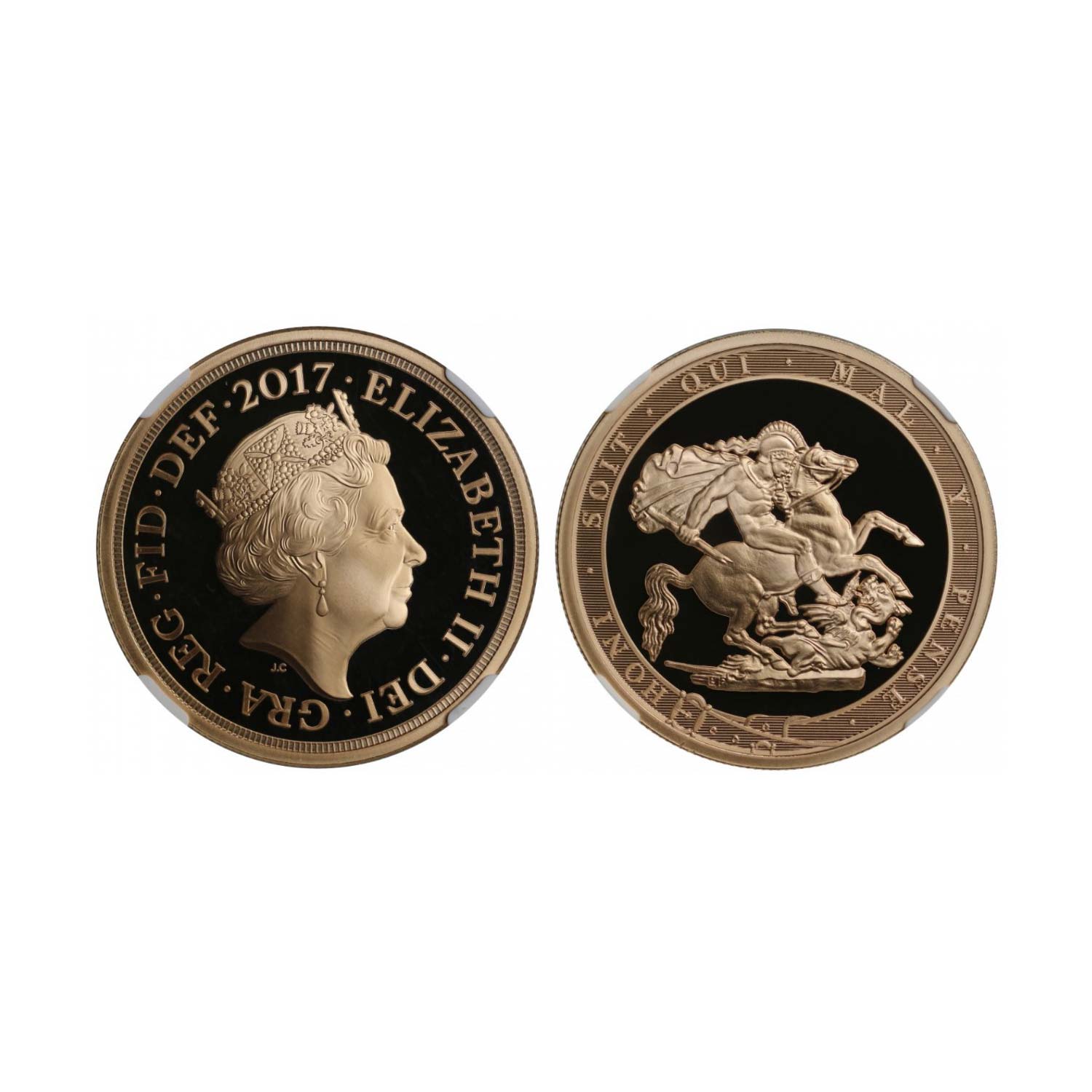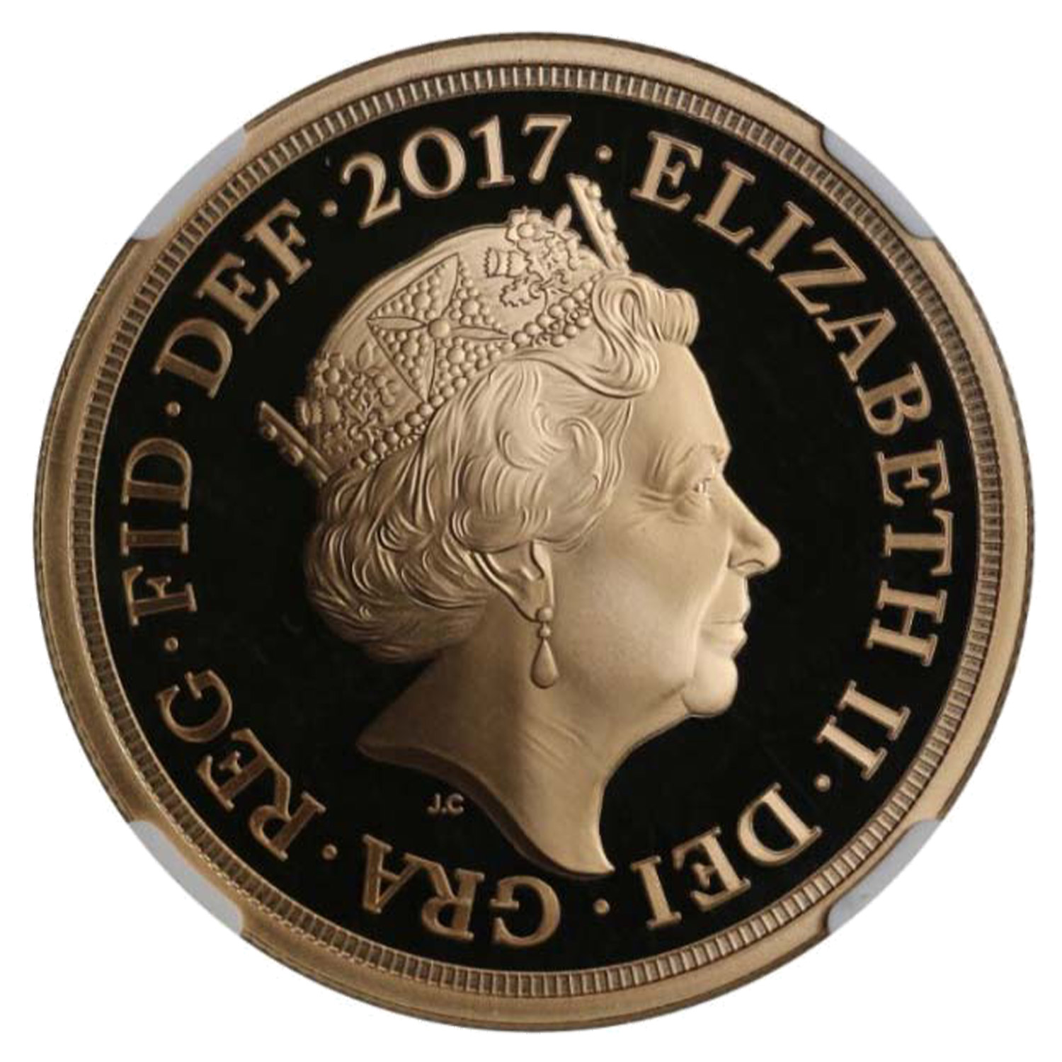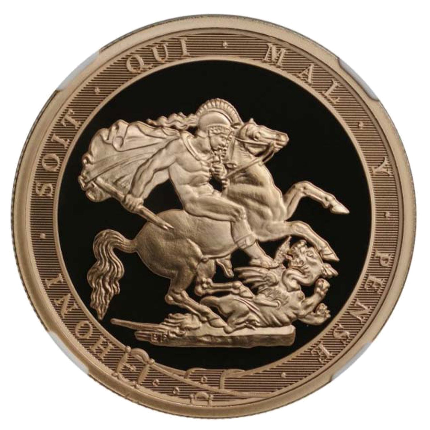 This was the first time that we used Pistrucci’s original masterpiece with the full inscription on a member of the Sovereign family since 1820. Struck to commemorate the 200th anniversary of the Benedetto Pistrucci Sovereign of 1817 and based on the original design of 1817 with the plumed helmet, St George and dragon right, surrounded by the Order of the Garter with a buckle, HONI SOIT QUI MAL Y PENSE.