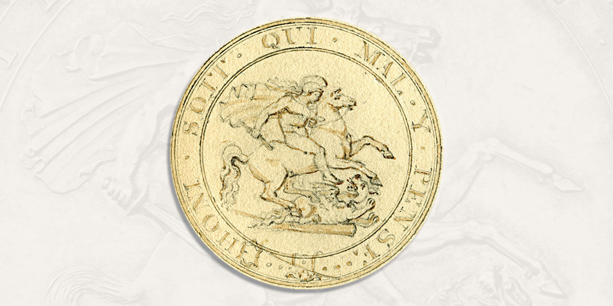 Featuring on Sovereigns struck for George III and George IV, Pistrucci’s design was replaced by a shield design for a time but then reinstated on the coin during the reign of Queen Victoria; it has appeared on Sovereigns struck for every British monarch since.