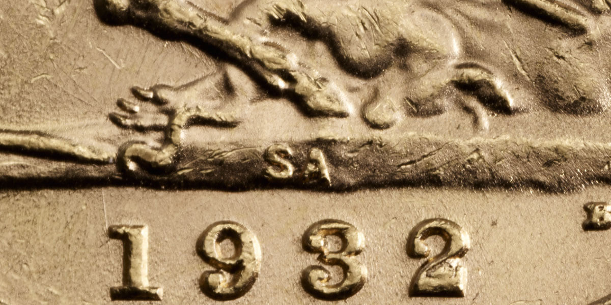 The branch mints were run from The Royal Mint in London, with staff sharing their knowledge and experience to ensure that the production of Sovereigns would be as consistent as possible, regardless of where it took place. Sovereigns produced at the branch mint in Pretoria featured the mint mark ‘SA’ on the reverse of the coin below Pistrucci’s design. The coinage portrait of George V appeared on the obverse, designed by Bertram Mackennal.