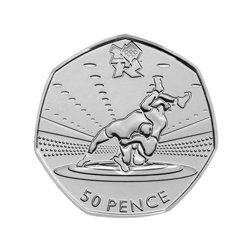 The London 2012 Olympic Wrestling 50p coin immortalises an all-action sport. Its reverse designer, Roderick Enriquez, created a futuristic look for a historic sport, capturing the moment a wrestler is thrown onto the mat in a modern stadium representation. Individual raised dots represent the watching crowd, and the purposely undersized mat emphasises the close-range nature of the bouts. The action silhouettes highlight the strength and technical skill involved in wrestling. his is the second rarest coin in the Olympic collection, and it is unlikely you will find it in your pocket today, but it remains one of the most collectable 50p pieces in circulation.