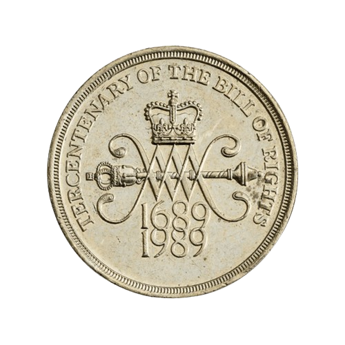 Features the ‘W&M’ (King William and Queen Mary) cypher interlaced, surmounting a Parliamentary Mace and representation of the Royal Crown above and the years 1689 and 1989 below, all within the inscription ‘TERCENTENARY OF THE BILL OF RIGHTS’.