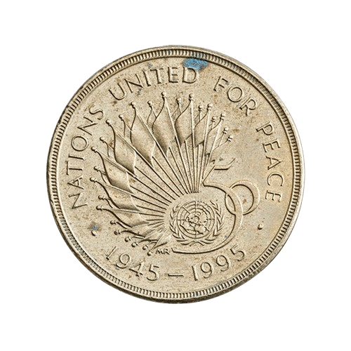 Featuring the 50th anniversary symbol of the United Nations and a fanning pattern of flags, the coin bears the inscription ‘NATIONS UNITED FOR PEACE’ above and ‘1945-1995’ below.4. 1945 In Peace Goodwill, 1995