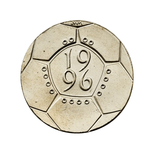 Commemorating the 10th European Football Championship, it features a stylised representation of a football, with the year 1996 centrally placed and encircled by 16 small rings.’