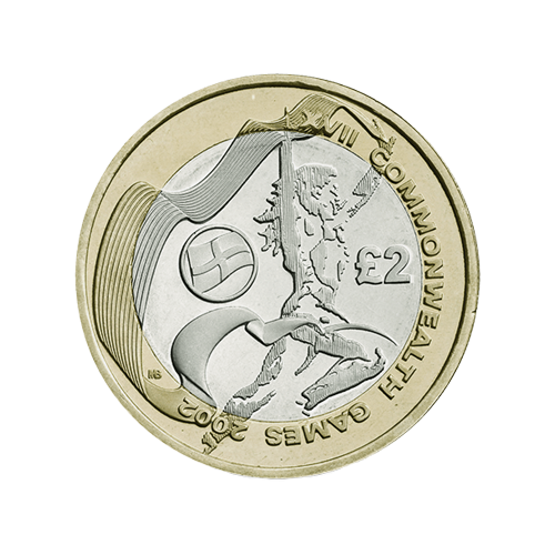 Struck to commemorate the transition of the Olympic Games from London to Rio de Janeiro, the 2012 Olympic Games Handover £2 coin symbolises the passing of the Olympic flag from one host city to another. The reverse design, created by Jonathan Olliffe, depicts a baton being passed between two hands, with the flags of the UK and Brazil joined in motion. Like its predecessor, the coin carries the edge inscription ‘I CALL UPON THE YOUTH OF THE WORLD’.6. Commonwealth Games, Scotland 2002
