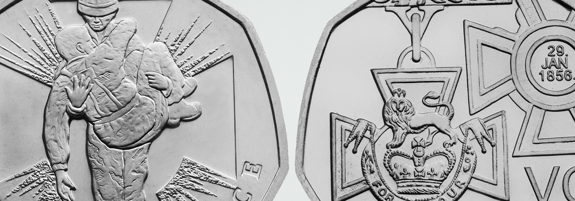 The Royal Mint Victoria Cross 50p coins bear two different designs. The first, depicting the Victoria Cross medal, was produced to mark the institution of the medal itself and the other showing a soldier carrying a wounded comrade celebrates the heroes associated with it.